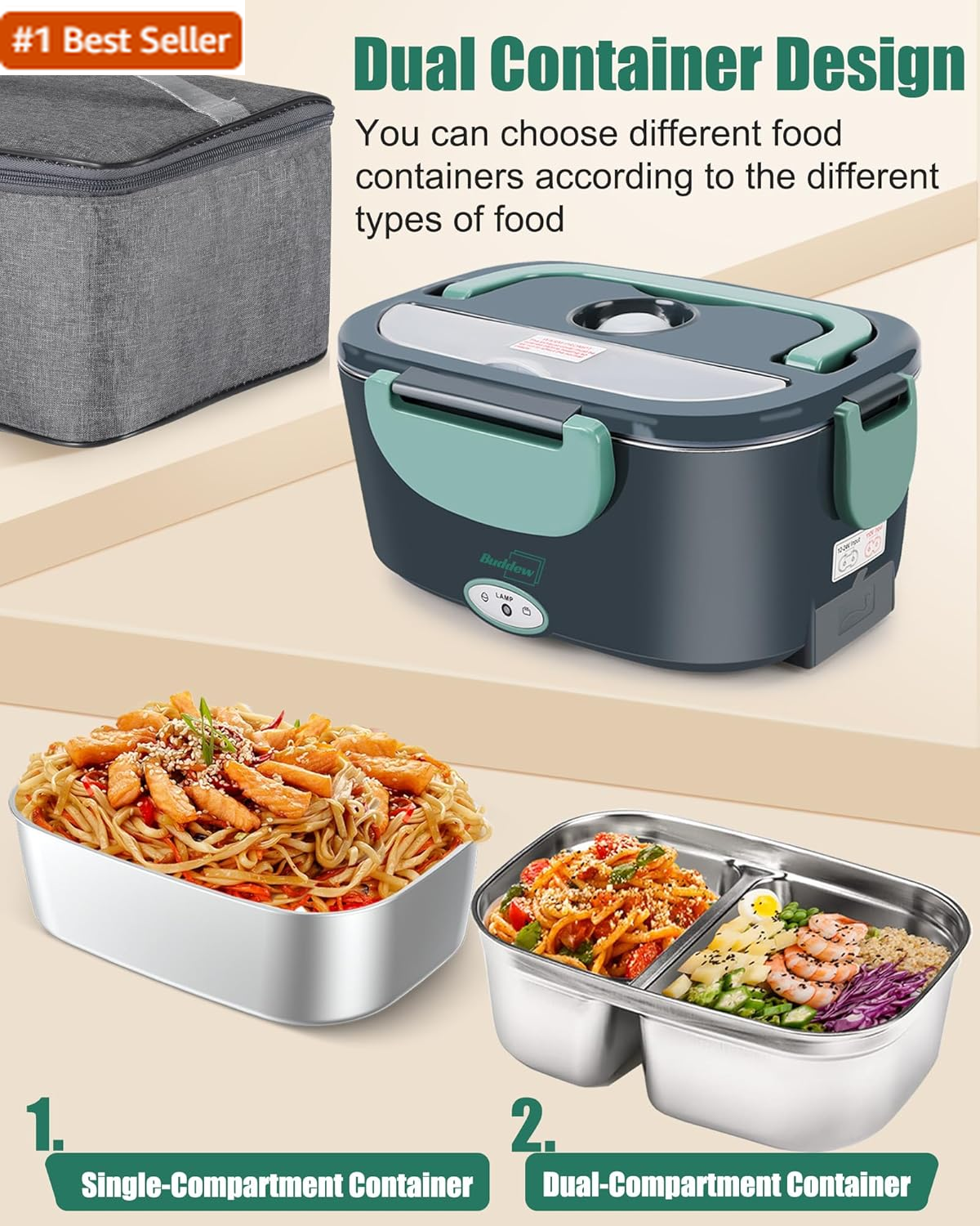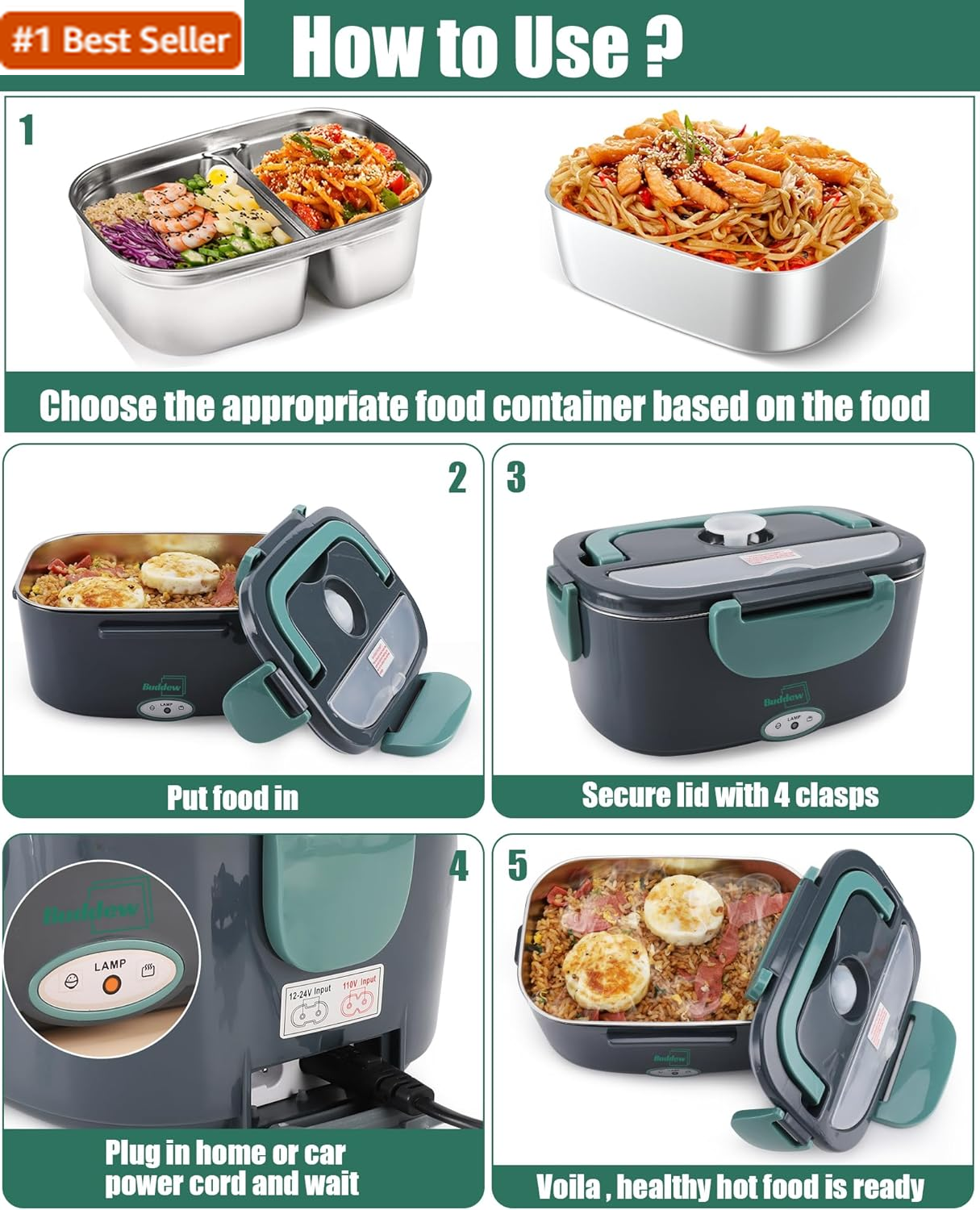 Buddew Electric Lunch Box 80W Food Heater with Dual Container, Portable Lunch Warmer for Adults, Upgraded Heated Lunch Box for Car/Truck/Office with SS Fork&Spoon and Insulated Carry Bag (Green) 80W Fast Heating --- It adopts the latest designed PTC constant temperature heating, and uses 80W high power.Low-consumption and high-efficiency thermal cycle, heating your lunch at the fastest speed, while maintaining the moisture and freshness of the food. No need to eat unhealthy sandwiches and fast food anymore. You can eat fresh and warm home-cooked food in the shortest time office, and construction site! A healthy way of eating Two Replacement Container Design --- This lunch box includes 2 additional 1.5L stainless steel containers for your convenience. You can choose a food container in one compartments or two compartments based on the different types of food. More user-friendly design Why choose Buddew Electric Lunch Box? --- Great alternative to cold sandwiches. That's the reason why I found this Electric lunch box so great and useful. It comes with everything and it is really practical: easy to use, comes with everything (spoon, fork, fruit box, two kinds of charging cables), the space for the portion of food is good (you can eat very well). It takes 20 to 25 minutes to heat up, depending on the food and portion size, but you can use this time to do other things 3-in-1 Electric Lunch Box --- Instead of eating unhealthy fast food and cold sandwiches every day, This electric heated lunch box supports 110V home/office +12V car and 24V truck use. car / trucker drivers can eat home cooked warm meal healthily on the go, construction worker and office workers can enjoy hot meal at construction site or in office Now Beloved is Happy He Eats Hot Meal Every Day --- Prepare a Buddew Electric Lunch Box for your husband/lover/father who likes to bring lunch to work, After alot of cold sandwiches he will fall in love with this electric lunch box. We also love the fact that you can also use it on the go, in your car, boat etc...Great product for the cost, The Perfect Choice for Gifts Grab-and-Go Carry Handle --- Each Buddew electric lunch box also features a strong carry handle on top that makes it easy to take with you in the car or place at your desk. The AC and car plug-ins also make it easy to warm up food anywhere.Coming with an insulated carry bag. Don't worry about heavy rain and dust, keep the food fresh and clean Provide You with Satisfactory After-Sales Service at Any Time --- Because the product may be subject to some uncontrollable factors during transportation. If you find that the lunch box cannot be heated or has any other issues after receiving it, feel free to contact us and we will provide you with the perfect solution. Contact us Product Description Car/Truck Use You can also enjoy warm and healthy home cooked dishes in the car. Home/Office Use By bringing homemade meals, savetime and money on dining out. Outdoor Use Enjoy a hot meal on the go Construction Site Hard work requires nutritious and healthy home cooked dishes even more! 1 Car/Truck Use 2 Home/Office Use 3 Outdoor Use 4 Construction Site 80W High Power We have increased the heating power so that you can heat up your lunch in a shorter time.while ensuring the freshness of the food. Two Replacement Container You can choose a food container in one compartments or two compartments based on the different types of food. More user-friendly design! 3 in 1 Car and Home Dual Use Buddew portable electric lunch box contains 2 plugs: 12V/24V for cars and 110V for household use, allowing you to eat hot food anytime, anywhere. High quality lunch Bag Equipped with a lunch bag, the quality is higher than ordinary lunch bags on the market. Easy to carry, waterproof and dustproof, sturdy and durable. Buddew's Various Series of Electric Lunch Boxes Add to Cart Add to Cart Customer Reviews 4.6 out of 5 stars 578 4.5 out of 5 stars 6,090 4.5 out of 5 stars 6,090 4.4 out of 5 stars 2,138 4.4 out of 5 stars 2,138 4.4 out of 5 stars 2,138 4.4 out of 5 stars 2,138 Price $24.57 $ 24 . 57 $20.57 $ 20 . 57 $25.47 $ 25 . 47 $19.99 $ 19 . 99 $20.95 $ 20 . 95 $20.95 $ 20 . 95 — Power 80W 80W 80W 70W 70W 70W 70W Capacity 1.5L*2 1.5L 1.5L 1.8L 1.8L 1.8L 1.8L Removable Container ✔ ✔ ✔ ✔ ✔ ✔ ✔ Widely Use ✔ ✔ ✔ ✔ ✔ ✔ ✔ Voltage 110V/12V/24V 110V/12V/24V 110V/12V/24V 110V/12V/24V 110V/12V/24V 110V/12V/24V 110V/12V/24V Advantage Two Replacement Container Affordable High Power Large Capacity Large Capacity Large Capacity Large Capacity Item model number YY-3066 Style Lunch box Capacity 1.5 Liters Number of Items 1 Pattern BUDDEW Theme Car Number of Pieces 2 Unit Count 1 Count Manufacture Year 2025 Number of Compartments 2 Brand Buddew Material Stainless Steel Age Range (Description) Adult Is Discontinued By Manufacturer No Included Components 1 x Electric Lunch Box, 1 x Socket Powering Cable(110V), 1 x Spoon and Fork, 1 x Vehicle Powering Cable(12V/24V), 2 x 1.5L Replacement Container Item Weight 2.61 Pounds Special Feature Manual Color GREEN-Dual Container1 Item Form Multi-compartment container Shape Car Manufacturer Buddew Product Dimensions 4.56"D x 8.86"W x 6.1"H Product Care Instructions Dishwasher Safe Shipping Fast shipping is very important for us. Our standard US shipping service is FREE. Your order will be shipped within 2-3 business days upon full payment received. Your order will be delivered within 2-3 business days after the handling time. We only ship to the confirmed PayPal address. We reserve the right to cancel any order for any reason at any time. We are not responsible for undeliverable addresses. Returns and payment We offer a 30 days return policy from checkout winning date. We allow only PayPal as payment method FeedBack Your feedback very important to us, after you get your package and you are satisfied with our service please leave us positive feedback If you have any problem with your order / any questions 