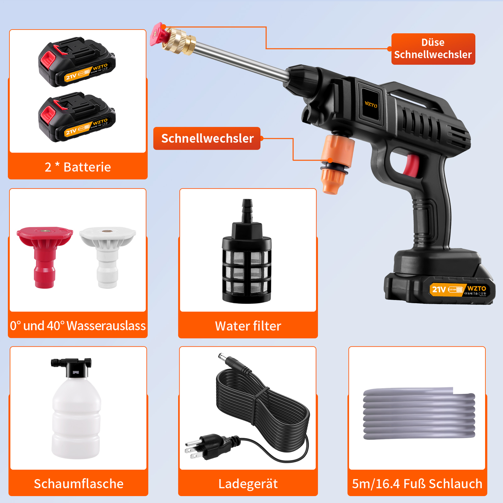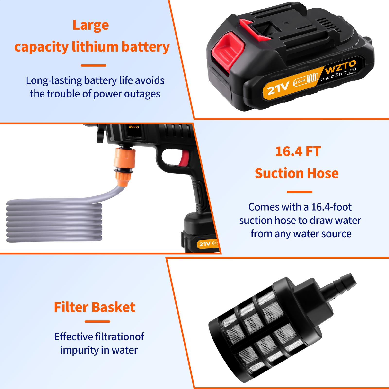 新建网页 2 新建网页 1 新建网页 1 Product Description 新建网页 1 Powerful lithium battery high-pressure cleaner: The wireless powerful cleaner provides a powerful 1500W motor that can spray up to 215L/H. It is a truly portable electric car wash machine that allows you to easily and quickly clean all outdoor spaces and equipment. Get water from anywhere: This high-pressure cordless car wash weighs approximately 2.5 pounds. The 16.5-inch hose with a filter basket can effectively filter impurities, particles, waste leaves, or sludge, better protecting our press. Compared to others, our battery power supply has lighter pressure and is more portable. Do more power: The portable pressure cleaner powered by batteries provides a 2.0Ah battery to ensure long battery life; This battery is suitable for various power tools and provides value for money. Two different nozzles are available for your use: effective cleaning. Our battery powered wireless high-voltage cleaning machine is equipped with 0 ° and 40 °. The 40 ° water outlet nozzle sprays water mist, suitable for garden watering and plant irrigation, while the 0 ° water outlet nozzle provides a direct and powerful water column, which can remove stubborn stains. Specifications: Type: Wireless car wash machine Color: Black Material: ABS Battery capacity: 2.0Ah Type: 2 batteries Charger voltage: AC 100-220V 50/60Hz Power: 1500W Pressure: 30 Bar-60 Bar Flow load: 4 L/Min-8 L/min Water pipe length: 5m/16.5ft Speed: 15000 revolutions per minute What should I do if the machine doesn't start after pressing the trigger? 1. Check if the lithium battery is dead. If it is dead, charge it with a charger. 2. Observe whether the inlet pipe is bent or blocked. 3. Press and hold the trigger continuously for more than 10 seconds to allow water to be drawn into the body. Packaging List 2 * Battery 1 * Host 1 * 5M water pipe 1 * foam spray tank 1 * Charger 1 * Extension rod 1 * User Manual 2 * Rotating nozzle 1 * Water pipe joint 1 * Water filter =