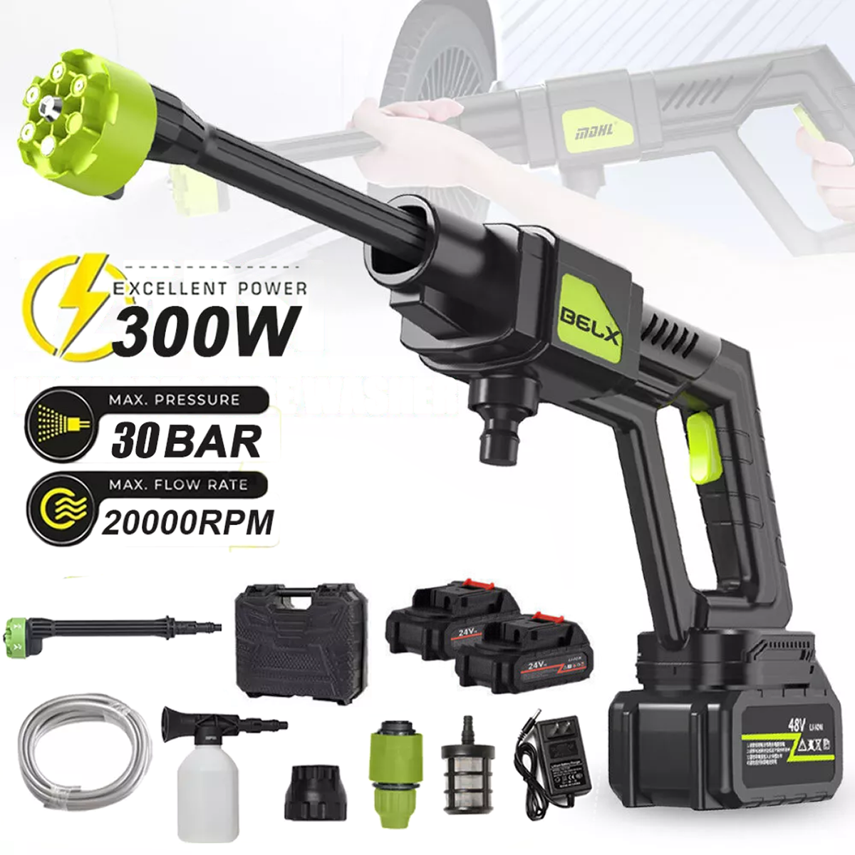 Features : 【Upgraded brushless motor】 【Multiple Spray Patterns】 【POWERFUL BATTERY】 【Draw Water from Anywhere】 【Versatile Use】 Specification : Motor: Brushless Motor Material: ABS and copper Power Supply:Lithium battery Battery capacity: 12000mAh(Note: A single battery is 1200mah, a total of 10 batteries are connected in series and parallel) Power:300W Rated voltage:21V maximum voltage:48V Product pressure: 30Bar Drive: Lithium battery wireless drive Spray type of water gun: 6-IN-1 Multi-Function & Rotatable Spray Nozzles Jet stroke: 6-12 meters Water pipe length: 5 meters Car washing equipent type: household car washing machine Water source type: Bucket / Faucet Self-priming Scope of application: car washing, watering flowers, water vegetables, spraying, garden cleaning, etc. 6 In 1 Cordless Car High Pressure Washer Jet Water Wash Cleaner Gun + 2 Battery Features : 【Upgraded brushless motor】: Most cordless pressure washers use brushed motors for it ,we use brushless motors .brushless motor is upgrade motor ,it has higher efficiency and controllability, longer working life ,save electric power , brushless motors lack brushes and physical commutators, they require less overall maintenance .and its cost is also much higher than brushed motor. 【Multiple Spray Patterns】:The battery powered pressure washer is equipped with adjustable nozzles from 6in1 nozzles and foam sprayers. You can turn the nozzle freely according to your cleaning needs. Easily removes all kinds of stubborn stains. Suitable for a variety of scenarios, including vehicle cleaning, exterior wall and floor cleaning, window and door cleaning, etc. Foam bottle attachment for quick foaming to easily remove stains from vehicles and windows. 【POWERFUL BATTERY】:Powered by 2 21V batteries, it is not limited by wires, very convenient to carry outdoors. One charge can provide up to 30-50 minutes of uninterrupted cleaning experience. 【Draw Water from Anywhere】: The portable pressure washer with a 16.4FT hose that makes it easy to take water from any source, so it's suitable for rivers, pools or buckets. It can also be connected to a faucet. The hose is equipped with a filter that effectively filters out particles, waste leaves or sludge, making it easy to draw water from buckets, pools, rivers or any water source. 【Versatile Use】Widely used for cleaning vehicles, bicycles and boats. The portable electric cleaner is also perfect for a variety of cleaning tasks in the home and garden. It effectively waters plants, cleans walls, floors, bathrooms, swimming pools, doors, driveways, fences and hard-to-reach corners. Specification : Product name: Wireless High Pressure Car Wash Washer Gun Motor: Brushless Motor Material: ABS and copper Power Supply:Lithium battery Battery capacity: 12000mAh(Note: A single battery is 1200mah, a total of 10 batteries are connected in series and parallel) Power:300W Rated voltage:21V maximum voltage:48V Product pressure: 30Bar Drive: Lithium battery wireless drive Spray type of water gun: 6-IN-1 Multi-Function & Rotatable Spray Nozzles Jet stroke: 6-12 meters Water pipe length: 5 meters Car washing equipent type: household car washing machine Water source type: Bucket / Faucet Self-priming Scope of application: car washing, watering flowers, watering vegetables, spraying, garden cleaning, etc. Package included: 1x Wireless car washing machine 1x Lithium battery 1x Charger 1x 5m Water pipe 1x 6-in-1 nozzle 1x Filter 1x Foam pot 2x Adapter Payment Shipping Return Contact us About us Payment 1.Paypal, Credit Card, G Pay etc, many payment way is accepted. 2.Please be sure your shipping address is correct before make a payment. Shipping 1.We will ship out the item within 1-3 business days after comfirming the payment, appreciate your patience. 2.If the items are broken on the way( we will check the orders clearly before we sent them ),please contact us in 3 days you received it. We will send you a new one or refund your payment. Return 1.We stand behind every buyer.Items can be returned for exchange or refund within 30 days. 2.Please contact us when you have any confusion of our item, we will solve the trouble for you as soon as possible. Contact us 1.This is professional Seller.We will reply your message within 24 hours. 2.Please contact us whenever you have any question about the item. We will deal with it as soon as possible. 3. If you are unhappy with the item or our service,please Contact Us before leave feedback,just give me a chance,thank you! About us 1. Unless specified otherwise, all our products are IN STOCK and are shipped from Local warehouse - Not Overseas! 2. We provide a 30 day Satisfaction Guarantee or your money back (provided items are in the same new and resaleable condition.) 3. We have a PayPal Verified Business Account, please buy with Confidence! 4. Every item will be tesrted before send.We know our products well and if we don't have the answers we will do our best to find them for you! 5. Our friendly team look forward to serving you! Your satisfaction is our No.1 Priority We will do our best to satisfacy you.