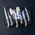 Hunting Deer Knife Set Field Dressing Kit Portable Butcher Game Processor Set, 12 Pieces Game Knife Set Includes: 12" Boning Knife; 9-1/2" Gut-Hook Skinner; 8-1/2" Hawkbill blade knife; 8-1/2" Caping Knife; 12" Gut-Hook Butcher Axe; 10-1/2" Skinning Cleaver; 8-1/2" Bone Saw; Ribcage Spreader (6-7/8" to 12"); 9-1/4" Game Shear; 11-7/8" * 7-7/8" Cutting Board; Knife and Shear Sharpener; Cleaning Gloves. Materials and Designs: Handles are all in black-and-blue camo colours with ergonomic materials for concealing and non-slip purposes. Handles and blades are manufactured in great balance in multiple practices. Blades are made of 7cr17mov steel and have experienced 7 times heat-treated tests to ensure their hardness and durability. Portable and Organized: Our knife set almost has all the tools and knives you need for the game, you can take the set everywhere you go and keep them all in case. Warm Notice: All tools should be kept in place for safe use. Always be aware of the blades while in use. Clean the knives after use is necessary for the long run. Satisfaction SATISFACTION GUARANTEEd: We provided a solid satisfaction and friendly 24/7 customer service to make sure your purchase was .