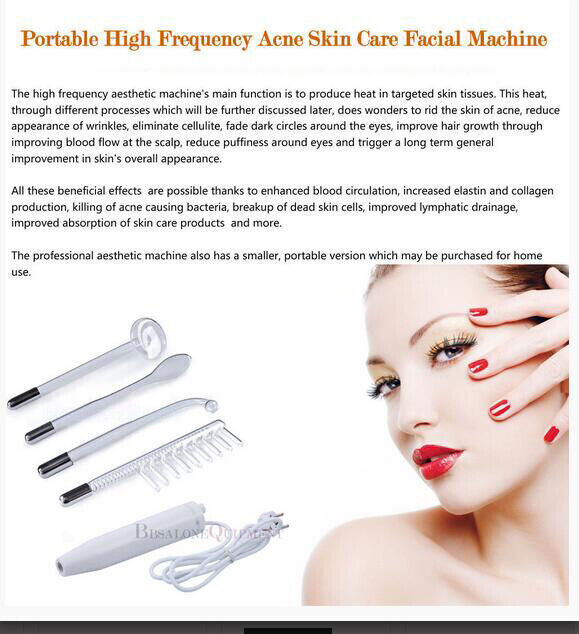 Item Code:1 X High Freqeuncy Machine with 4 Electordes ( NOT include the storage box) Work Voltage:110V Frequency:50Hz/60Hz Operation Area:For all treatment areas Specialty:Approximate Diameter At Tip: = 11.23 mm - 11.25 mm (can fit 12mm unit)Approximate Circumference At Tip = 35.3 mm(Attention: If intending to use this high frequency electrode with other high frequency equipment, carefully review the diameter and circumference measurements provided above prior to purchase to ensure proper compatibility and fit.) Color:Violet/ Orange Packaging Standard:Carefully packaged with soft material Specification: Item Code:1 X High Freqeuncy Machine with 4 Electordes ( NOT include the storage box) Work Voltage:110V Frequency:50Hz/60Hz Operation Area:For all treatment areas Specialty:Approximate Diameter At Tip: = 11.23 mm - 11.25 mm (can fit 12mm unit)Approximate Circumference At Tip = 35.3 mm( Attention: If intending to use this high frequency glass tube with other high frequency equipment, carefully review the diameter and circumference measurements provided above prior to purchase to ensure proper compatibility and fit.) Color:Violet/ Orange Packaging Standard:Carefully packaged with soft material International Buyer Please Note: A.Import duties, taxes and charges are not included in the item price or shipping charges. These charges are the buyer's responsibility. B.Please check with your country's customs office to determine what these additional costs will be prior to bidding/buying. Introduction: High frequency uses alternating current to conduct energy to a gas when it isignited. Glass glass tubes contain either Argon (violet) or Neon (orange) gas. When light energy is given off, it forms electricity around the glass tube. When the oxy air, naturally present in the air around the glass tube is electrified, it forms ozone.It is especially useful after the extraction phase of a facial because it kills germs, dries excess oil and increases healing. Differences betweent Violot and Orange: The violet glass tubes have been used to treat acne prone skin. An extremely small amount of ultra-violet light is emitted when the violet glass tube makes contact with the skin. Such brief and low level UV light exposure is considered safe and provides excellent anti-bacterial and healing benefits. The orange glass tubes are generally used to treat aging skin because they are said to direct more warmth to the treatment area which promotes blood circulation, encourages cellular turnover and improves product penetration. Functions: a. Sterilize skin with special ultraviolet/infrared ray b. Point or large area treatment can be selectable by using different glass tube c. heal acne,anti-aging, anti-wrinkle and skin-tightened. d. Improve hair growth by using grass hair comb e. Glass glass tube quantity can be selectable f.Accelerate blood circulation and improve metabolism. G.It produces the ozone for sterilization, can help wound to heal and to restrain pores. Delivery details 1. We ship WORLDWIDE ( Except Italy and Africa) !! 2. All the orders normally will be shipped out within 2-3 business days after payment received. 3. Shipping Method: A.All nail product we ship through AIR MAIL of Hong Kong Post Office B. Machine ship by EMS. 4.Shipping Cost: A.Hong Kong Post: Same price to most of the country. B. EMS: Different cost for different country,please contact us for further detail information. 5. Delivery time: A. Hong Kong Post: 14-21Business Days-deponds on the city and country B. EMS: 10-14 Business days-deponds on the city and country ***Delivery time can be longer during Holiday or custom checking. 6.We will need the following detail for deliver: 1) Name 2) Phone number (very important) 3) Detail address 4) Post code (We do not ship to P.O Box) 7.Tracking no. A. HongKong Post: Usually we ship nail product using Hong Kong Post's mail without tracking no. B. EMS Express: With tracking no. 8.We offer Combined Shipping discount,please contact us for more information. If you are interested in bidding/purchasing any of our other items ending at a later time, please contact us to hold and settle final shipment. 9. International Buyers – Please Note: a) Import duties, taxes and charges are not included in the item price or shipping charges. These charges are the buyer’s responsibility. b) Please check with your country’s customs office to determine what these additional costs will be prior to bidding/buying. 10. About delivery: A. If packages are delivered in unfit condition, please refuse shipment and contact us within 24 hours B. In normal condition, please OPEN the packet and CHECK immediately before you sign for the packet. Defective items or missing parts must be reported within 24 HOURS After RECEIVE. 11. Important Note: All the Arrive Day is under normal condition, special condition could happen(custom open the packet to inspect, bad weather, Christmas and so.), Pls do not worry too much and contact us or the express company, we will try our best to help sloveing the problem. Terms of sales 1. Please make sure you understand what you are bidding/buying and contact us for all the information you may need before you place an order. 2. All products are thoroughly inspected prior to dispatch 3. We accept return of 14 days of receipt, please make sure the return item must be in original shape/packing and working order 4. Buyer pays for all return postage costs and 20 percent restocking fee 5. Return item must be shipped by registered mail with tracking number 6. About WARRANTY 1) All equipment and salon furniture carried by us comes with a limited 1-year warranty,except hydraulic pump for limited 2-years. 2) Nail product, Disposable and other products do not have warranty 3) Equipment parts and accessories have 20 days warranty. Glass spare part no included. 4) Our limited warranty does not cover the damage caused in improper installation, excessive use or alteration. For more information about warranty,plea