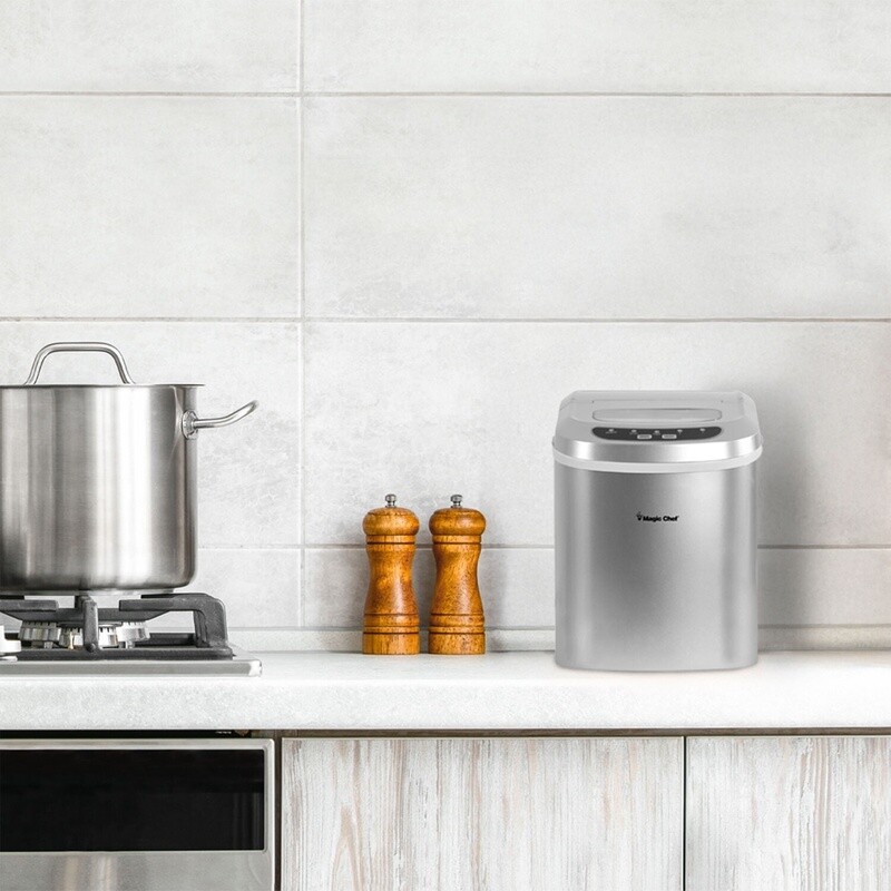 Tired of running out of ice during gatherings with friends and family? Look no further! The Countertop Ice Maker MCIM22B is here to make sure you never run dry on ice again. Efficient Ice Production: This ice maker can churn out up to 27 lbs. of ice per day, ensuring a steady supply to keep your ice bucket or beverage pitchers topped up. Quick and Easy: With its rapid ice-making capability, you can have ice in as little as 7 minutes. Just add water and select your preferred ice size! Ample Ice Storage: The ice maker can conveniently store up to 1. 5 lbs. of ice at a time, so you won't have to worry about constantly refilling it. Digital Control Panel: The user-friendly digital control panel keeps you in the know. It indicates when it's time to empty the ice storage bin, so you're always prepared. Smart Indicator Lights: Stay informed with indicator lights for both water and ice levels. No more surprises when you're running low on either! Upgrade your ice game with a new Countertop Ice Maker. Say goodbye to ice shortages and hello to uninterrupted chilling. Order yours today and keep the party going! Easy to use digital control panel with indicator lights and viewing window to monitor ice level Makes approximately 9 ice cubes per cycle and up to 27 lbs of ice per day Just add water and have ice in as little as 7 minutes Choose between small or large ice ; unused ice cubes automatically recycle back into reservoir Removable ice basket and scoop. Drain water with built in drain cap Plastic construction for durability UL listed for safety