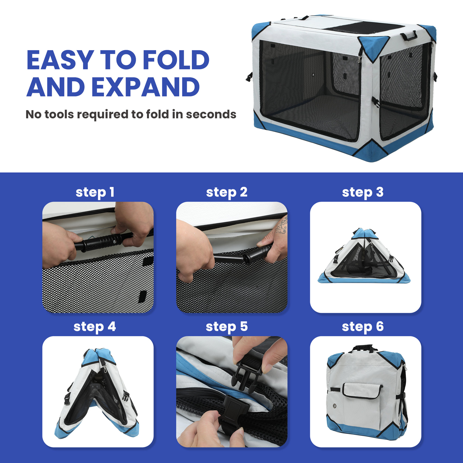 Portable Dog Crate Large Pet Travel Carrier Waterproof Camping Cage w/ Plush Pad < /div> Product Description NOTE: Professional Installation would be Highly Recommended. Description: 1. Color: Light Gray + Deep Blue 2. Material: Iron Tube, 600D Oxford Fabric, Eyelet Mesh Fabric 3. Special Design: Waterproof, Zipper Closure, Storage Bag, Three Sides Doors, Top Openable 4. Suitable for: Large Size Dog/Pet, Travelling Carrier, & Camping Cage Features: 1. Spacious and Convenient: This collapsible dog crate measures 36" L x 25" W x 25" H, providing ample space for pets up to 32" L and 21" H, with a maximum weight of 70 lb. Perfect for home and travel use. 2. Portable Design: Lightweight at 10.2 lb, this dog crate is easy to transport. The included storage bag makes it convenient to pack and carry, perfect for on-the-go pet owners. 3. Versatile Access: Features three side doors and a top that can be opened, allowing easy access and flexibility. The zipper closures ensure your pet remains secure while providing hassle-free entry and exit. 4. Durable Construction: Built with a sturdy iron tube stand and reinforced with spray coating. The 600D Oxford fabric and 190g eyelet mesh fabric ensure durability and breathability for your pet's comfort. 5. Waterproof and Easy to Clean: The waterproof fabric ensures easy maintenance and cleanliness, keeping your pet dry and comfortable in all conditions. Ideal for both indoor and outdoor use. Dimensions: 1. Overall Dimensions: 36" L x 25" W x 25" H 2. Maximum Pet Size: 32" L x 21" H 3. Maximum Weight: 70 lb 4. Item Weight: 10.2 lb Package Included: 1. 1x Dog Crate 2. 1x Accessory Kit 3. 1x Instruction Shipping 1. Normally the item will be dipatched within 1 business day if payment is cleared before 12pm PST. 2. Please verify the correct shipping address in your PayPal account before making the payment. We only dispatch the item to the address that is sent to us at the time of checkout. 3. We don't ship to Hawaii, Alaska, Puerto Rico, APO/FPO/PO Boxes. 4. We don't provide local pick-up service. 5. Normally we will use USPS, UPS, FedEx & LTL to dispatch items. Payment 1. We accept PayPal and credit card. 2. We will ship to the confirmed Paypal shipping address that is provided with the payment only. Return 1. 30 days Money Back Guarantee. 2. Please contact our customer service to receive a RMA form first if want to return the item. 3. All returned items MUST in new condition with the original package. Contact If has any problem, please contact us by sending an ebay message. Our customer service will resolve the problem as soon as possible. On Feb 13, 2025 at 02:28:40 PST, seller added the following information: