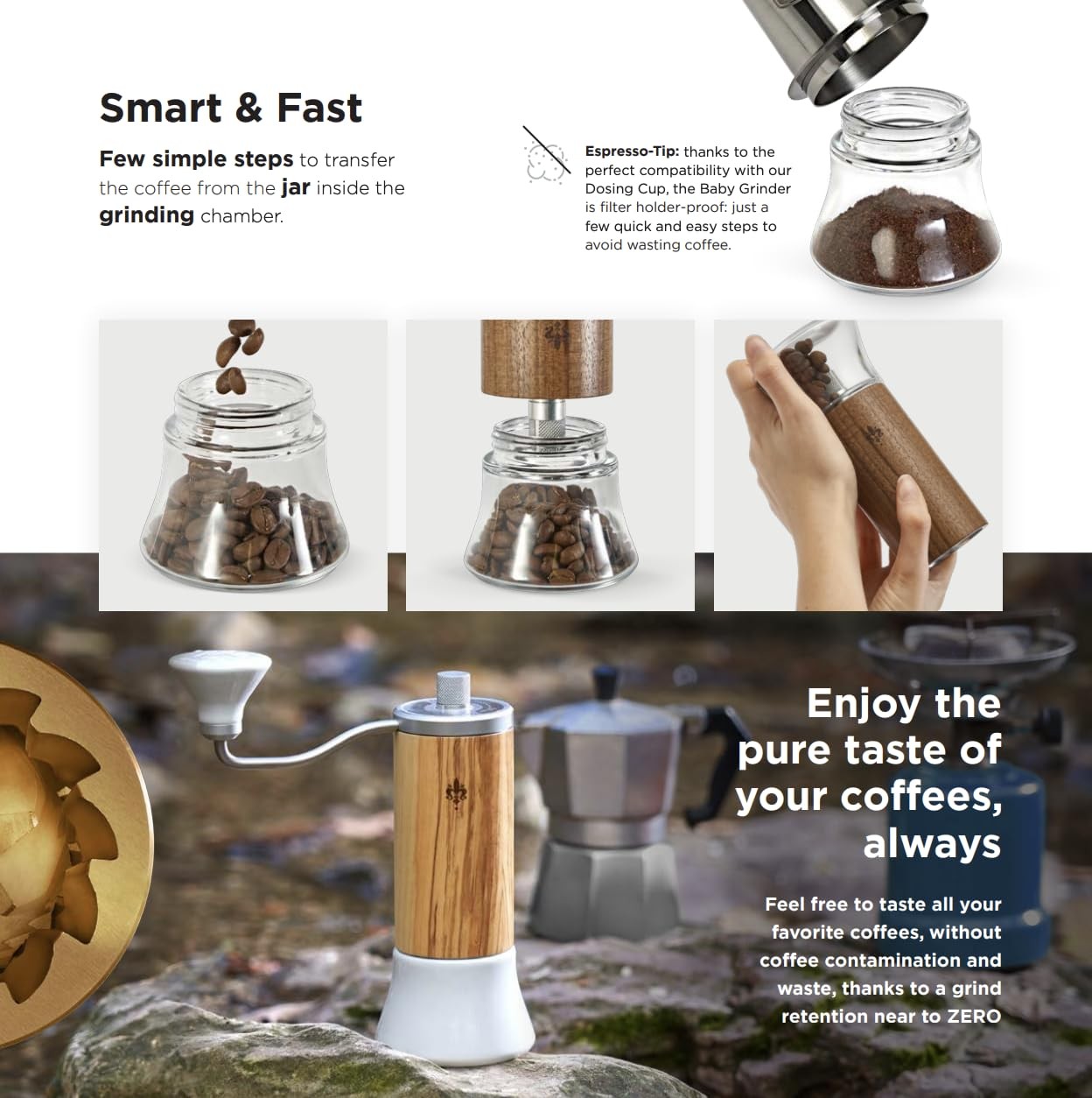 The Baby is 's first ever manual coffee grinder. It comes with 48mm conical burrs, with a specific Espresso & Brew design to offer excellent and uniform results in any type of extraction methods. The Special “Gold Energy” treatment developed by and ITALMILL GRINDING TECHNOLOGY increases the overall burrs lifetime by approximately 50% as opposed to standard hardened steel burrs. ☕ Stylish and Technologically Advanced: The Baby Grinder is a hand-operated coffee grinders that stands out for its combination of style and advanced technology. Its sleek design and innovative features make it a standout choice for coffee enthusiasts ☕ Enhanced Burr Durability: Equipped with 48mm conical burrs treated with ’s exclusive “Gold Energy” technology, this espresso grinder boasts increased durability. The special treatment enhances the burrs' lifespan by approximately 50% compared to traditional hardened steel burrs, ensuring long-lasting performance and consistency in grinding. ☕ Versatile Brewing Compatibility: Designed for flexibility in coffee preparation, the Baby Coffee Bean Grinder is suitable for a range of brewing methods, from espresso to pour-over. This versatility makes it a practical choice for those who enjoy experimenting with different coffee styles and flavors. ☕ Precise Grind Adjustment: The burr grinder features a stepped burr adjustment system, allowing users to make quick and precise changes to the grind size. This enables fine-tuning to achieve the perfect grind consistency for various brewing methods, ensuring optimal extraction and flavor in every cup. ☕ Ease of Use and Ergonomic Design: With its slim and ergonomic design, the Baby Espresso Bean Grinder is easy to handle and operate. The intelligently designed crank arm and flared jar minimize effort during grinding, providing a comfortable and efficient user experience. ☕ Portability and Freshness: One of the standout features of the Baby Manual Coffee Grinders is its portability. It can be easily disassembled and transported, making it an excellent option for coffee lovers who want to enjoy freshly ground coffee both at home and on the go. Additionally, the near-zero grind retention ensures that each grind is fresh, without any cross-contamination or waste, delivering a consistently flavorful cup every time.