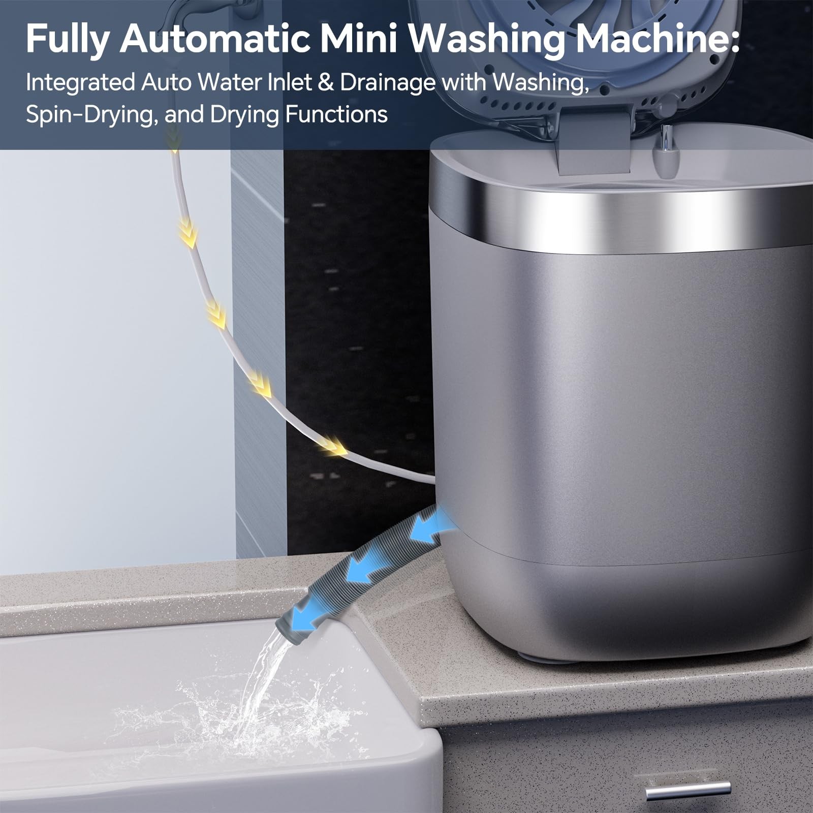 Looking for a Convenient, Space-Saving Laundry Solution? This Portable Mini Washing Machine is designed to make your life easier with its all-in-one functionality and compact design. Here's why it’s the perfect choice for small spaces, dorms, or travel: 1. All-in-One Design: Wash, Spin, Dry, and O₃ Deep Clean This mini washer does it all in one compact unit: ✔️ Washes your clothes thoroughly. ✔️ Spins out excess water for faster drying. ✔️ Dries your garments with hot air, even in cold or humid weather. ✔️ O₃ Deep Clean using advanced cleaning technology to eliminate odors. 2. Automatic Water Inlet & Drain System Simplify your laundry routine: ✔️ The machine automatically fills and drains water through its 4-point water inlet and drain system . ✔️ Just add detergent, turn on the faucet and power, and let the washer handle the rest. 3. Active Oxygen Stain Removal Say goodbye to stubborn stains: ✔️ The active oxygen cleaning technology penetrates deep into fabric fibers. ✔️ Removes tough stains while keeping your clothes fresh. 4. Hot Air Drying for Comfort Stay comfortable no matter the weather: ✔️ The built-in hot air drying function ensures your clothes are dry and ready to wear. ✔️ After drying, the machine switches to a circulating air mode (up to 6 hours) to keep your garments fresh. 5. Spacious 7L Capacity Despite its compact size, this mini washer can handle: ✔️ 2-3 pieces of underwear. ✔️ 3-4 pairs of panties. ✔️ 2-3 towels. ✔️ 2-3 baby clothes. ✔️ 7-8 pairs of socks. Perfect for everyday use or specialized laundry needs like delicates, baby clothes, and more. Why Choose This Mini Washer? ✔️ Compact and Portable: Ideal for small apartments, dorms, or travel. ✔️ Energy-Efficient: Designed to save water and electricity. ✔️ Easy to Use: Simple controls and automatic functions make laundry effortless. ✔️ Versatile: Handles a variety of garments, from underwear to towels. Kind Tips 1. Not suitable for washing large shirts and jeans: The capacity of the mini washing machine is only 7L, so large shirts and jeans are not supported! 2. Automatic Drainage: Connect one end of the drain pipe to the washing machine and place the other end in the sink or other place where water can be placed. The clothes will be automatically drained after washing. If the water cannot be drained out, or the water cannot be completely drained, the clothes will not be able to be dehydrated or dried. Please check whether the drain outlet of the drain pipe is lower than the bottom of the washing machine. 3. Proper Detergent Usage: Please make sure to put in the right amount of laundry detergent or liquid. Too much detergent will not only cause waste but may also lead to incomplete rinsing and leave residue on the clothes. The recommended amount of washing powder and laundry liquid for a 7L mini washing machine running at full load is: Washing Powder: Light soiling: 40-50 grams Medium soiling: 50-60 grams Heavy soiling: 60-70 grams Laundry Liquid: Light soiling: 40-50 milliliters Medium soiling: 50-60 milliliters Heavy soiling: 60-70 milliliters Upgrade your laundry experience with this efficient, reliable, and space-saving mini washing machine. Order now and enjoy clean, fresh clothes without the hassle! Automatic Water Inlet & Drain System:This mini washing machine features a convenient 4-point water inlet and drain design for quick and effortless water filling and draining. Simply add detergent, turn on the faucet and power, and let the machine handle the rest. Smart Dehydration & Drying Modes:With its advanced drying technology, this mini washer automatically washes, dehydrates, and dries your clothes. After hot drying, it switches to a circulating air mode (up to 6 hours) to keep garments fresh and comfortable. Hot Air Drying Function:Ideal for cold or humid weather, the built-in drying function ensures your underwear, socks, and delicates are thoroughly dried and ready to wear every day. Active Oxygen Stain Removal:Utilizing ozone technology, this mini washer penetrates deep into fabric fibers to remove stubborn stains and sanitize clothes, leaving them clean and odor-free. Spacious 7L Capacity:Despite its compact size, this small washing machine can handle up to 2-3 pieces of underwear, 3-4 pairs of panties, 2-3 towels, 2-3 baby clothes, or 7-8 pairs of socks, making it perfect for everyday use.