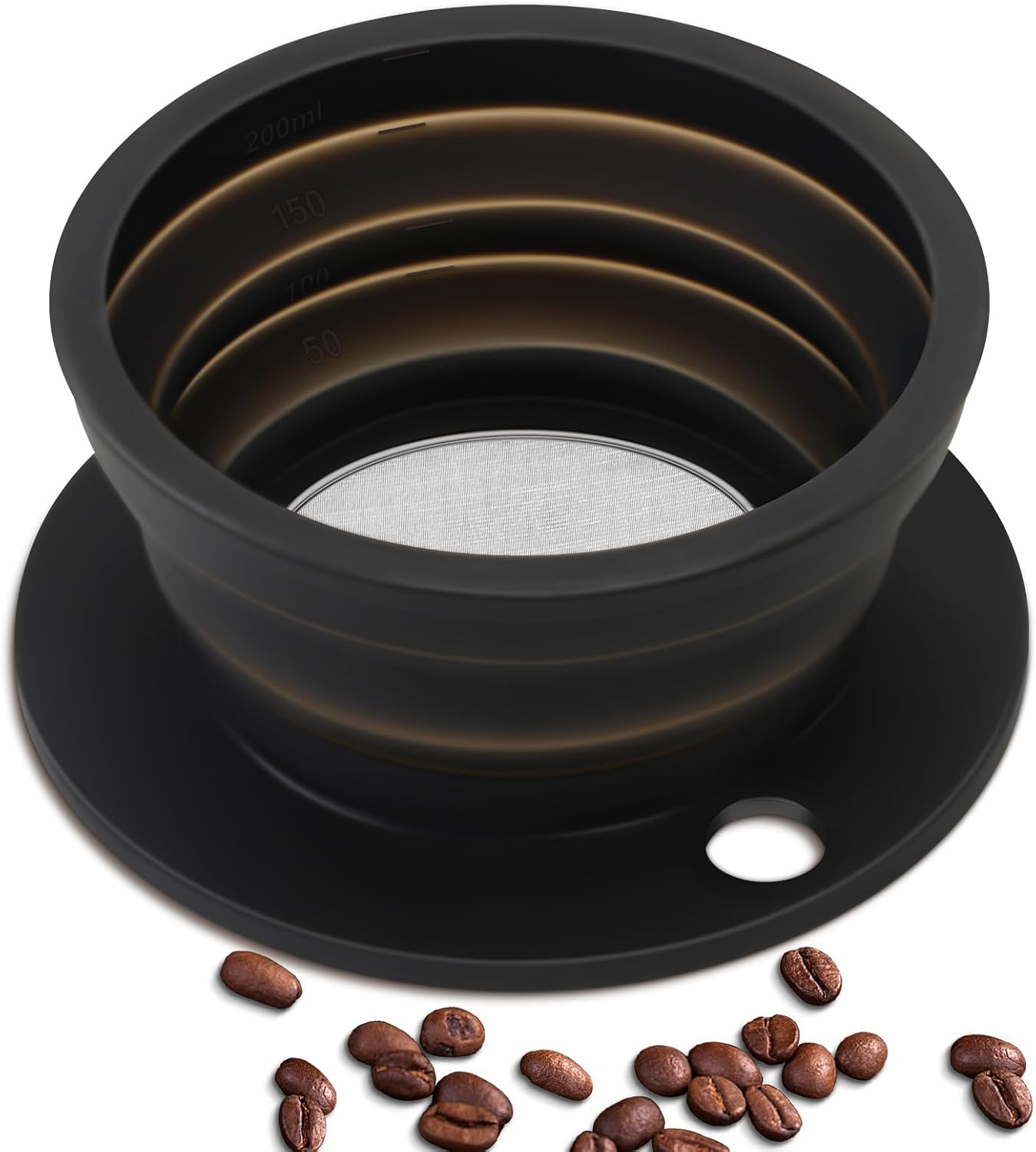 Store New Arrivals Add to Favorite View Feedback Contact Paperless Collapsible Pour over Coffee Dripper - Reusable Silicone Coffee Filter Pour over for Travel and Camping - Single Cup Drip Coffee Maker Pour over with Metal Mesh Coffee Filter (Black) Description Item model number VVG-001 Unit Count 1.0 Count Color Black Material Silicone,Stainlee Steel,Metal Country of Origin China Item Weight 2.39 ounces Shape Cone, Round, Basket Product Dimensions 4.13 x 4.13 x 1.97 inches Number of Pieces 1 [Paperless and Reusable]: Comeing with a reusable stainless steel coffee filter, the drip coffee maker pour over is paperless and reusable, no need to repurchase coffee filter paper, saving money in the long run, enjoying more authentic coffee [Collapsible Design]: Made of collapsible high-temperature resistant silicone material, this foldable coffee filter is lightweight and portable, making it easy to fit into your luggage or backpack, perfect for coffee camping, travel pour over, outdoor activities, and home use [Simple and Practical]: Simply put about 15 grams medium or coarse ground coffee into the unfolding coffee filter cone, pour in an appropriate amount of 200°F hot water, and wait for a few minutes, then you get a cup of delicious coffee for single serving. Due to its simple structure, the drip coffee maker pour over is easy to clean, simply rinse with water and air dry [Broad Applications]: With flat bottom design, the collapsible pour over coffee filter fits most of coffee mugs and cups with a diameter of 60mm~100mm, it is suitable for 1 to 2 people to use, allowing you to make the perfect handcrafted coffee that is both convenient and healthy [High-Quality Materials]: Made from food-grade silicone and stainless steel, materials used in this pour over coffee maker camping are safe, healthy, BPA free and free from unpleasant smells Product Description Paperless Design , enjoy the authentic taste of coffee without using paper filters! Ultra-thin foldable , 1.6cm thickness only after folding, great for camping or travel! Fine screen mesh , recommend to use approximately 15 grams of medium or coarse ground coffee and 200 ℉ hot water to brew one cup of delicious coffee for single serving. Wide edge , compatible with most of coffee mugs and cups with a diameter of 60mm~100mm. More extraction methods available. Easy to clean, simply rinse with water and air dry. Note: During the rinsing process, please try not to press hard on the metal mesh to avoid breakage. ABOUT US We offer the best prices around on high quality products. Our E-store includes media such as books, movies, music and games while offering electronics, toys, sporting apparel, clothing, tools, general home, garden items and more. SHIPPING We are always working hard to ensure your package arrives as soon as possible. Please understand that some factors like weather, high postal traffic, and the performance of shipping companies are outside of our control. We offer free shipping to the lower 48 states and ship within 2 business days of payment, usually sooner. We do not accept P.O. Boxes. Please provide a physical address. RETURNS We offer a 30-Day Return Policy on items which you are not completely satisfied with. You have the option for a full-refund or an exchange of the item. No returns are available on items shipped outside of the USA. PAYMENT We accept PayPal. CONTACT US This page content is yet to come Please ad us to your favorite seller and visit again later Thank You CUSTOMER SATISFACTION We try our very best to make sure every customer is completely satisfied. If there's a problem, message us! We're happy to help.
