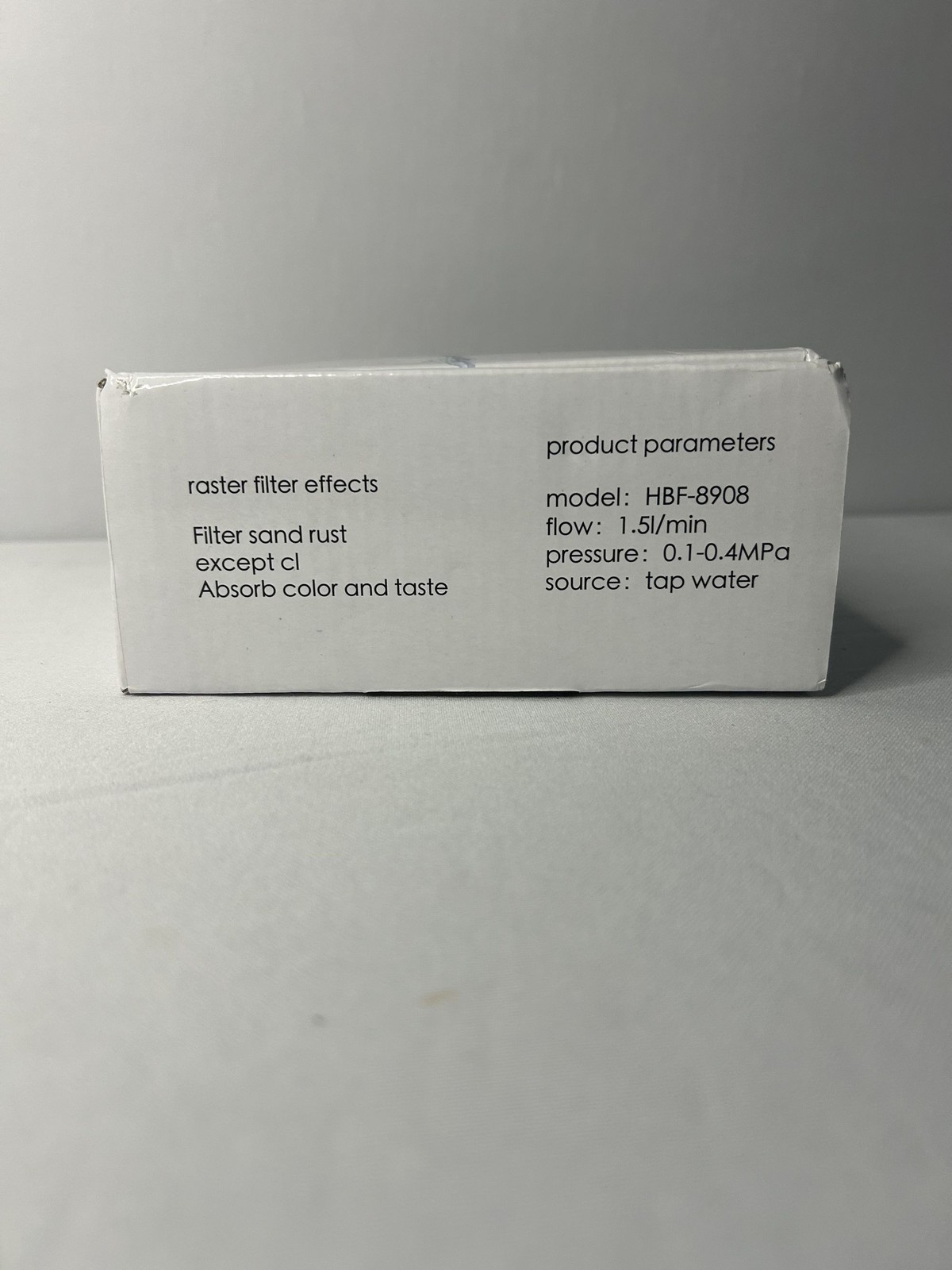 This tap water purifier offers efficient filtration with a flow rate of 1.5L/min, removing sand, rust, and impurities while improving taste. Its compact design fits easily on most faucets, ensuring cleaner and better-tasting water for your household needs. • Model: HBF-8908 • Flow Rate: 1.5L/min • Pressure: 0.1-0.4MPa • Source: Tap Water • Filtration: Sand, Rust, Taste Box has minor wear and slight creasing on the corners. Features: • All Season Condition: New Without Box