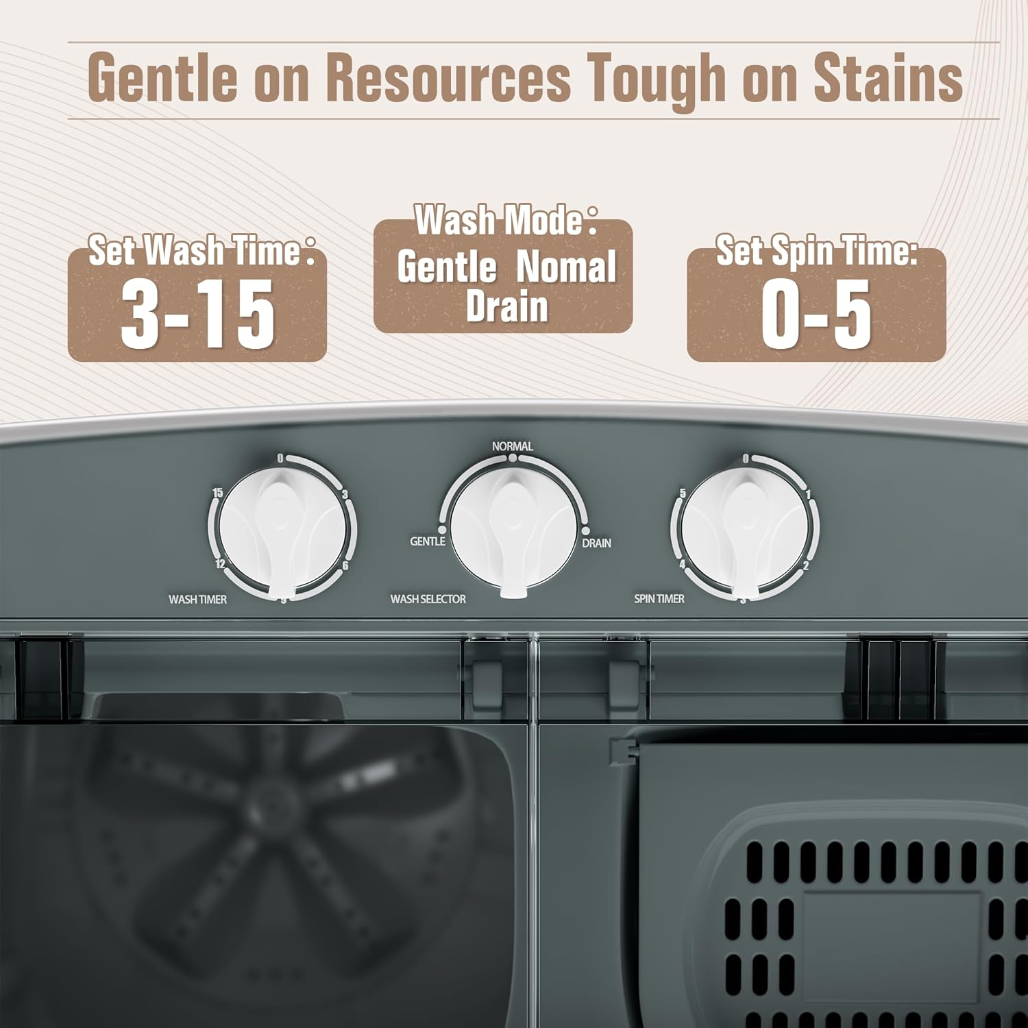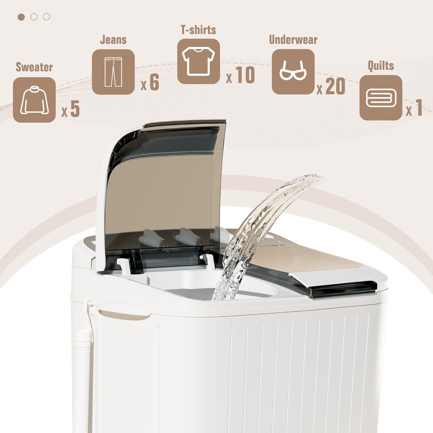 【Easy to Operate】: Portable mini washing machine saves you 30 times to go to the laundry, relax your hand and say goodbye to laundry expense. Based on washer button, put your clothes in - fill with water - set time - rotate start button - Go and Have rest. Simply enjoy fragrance of laundry detergent 【Powerful Performance】: The portable washer features a 1300RPM powerful motor with a max frequency of 60Hz,250W washing power and 140W spinner power, saving much effort on washing. Also, small washing machine combo has a drain pump, which allows you to easily drain out dirty water 【Twin Tub Design】:Twin tub washer machine is designed with washing tub and spin tub. A filter net on the side of washer tub for quick filtering. After washing, just take them out and put them into spin side of mini washer, let spin cover above the clothes to avoid the shaking and spinning 【Separate Time Control】:The apartment washing machine controls washing cycle is up to 15 minutes and the spinning cycle is up to 5 minutes each load, finish fast washing and saving you valuable time and. Washing modes: Gentle/Norma/Drain, which is free to set your timer and mode 【A gift and Assistant】: Lightweight and space-saving design of clothe washing machine is easy to move and portable, ideal for bathroom, camping trips, dormitories, or anywhere with limited space. By the way, such a beautiful and practical washing machine can be a gift for your family or friends Product Description
