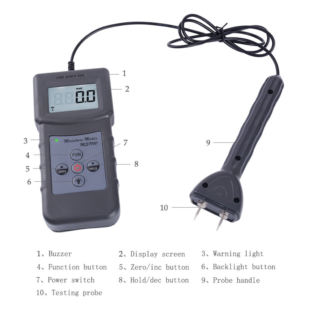 Portable Moisture Meter Analyzer Tester For Wood Furniture Flooring bamboo !!!Shipping Policy : Battery not included during the shipping!!! wood moisture meter: mainly used for measuring the water content of wood products, by the vast number of users has the following products used for measuring wood moisture content: wood, furniture, flooring, wooden doors, wooden pallets, wood flooring, composite flooring, bamboo flooring, wood sticks, wood, wood, plate, mahogany, wood products, packaging boxes, chopping board, plywood, wood powder, bamboo, wood, plywood, MDF, MDF, wood, wood, wood, wood, bamboo, wooden handle, etc. more than 150 kinds of domestic and international wood moisture content. The instrument adopts advanced integrated circuit the sensor technology and international advanced electronic components development, high measuring accuracy, stable performance, is the ideal choice for furniture and wood products industry to detect the moisture content of the product. Technical Specifications *Display mode: 4 bit backlit LCD display with LCD *Measuring range: 0~80% *Display accuracy: 0.1 *Measurement environment: Temperature: -10℃~60℃ Humidity: 5%~90% *Measuring principle: conductance method, temperature compensation *Accuracy: ±0.5% *Response time: 1 second * Power supply: 4x1.5V AAA (UM-4) battery (Battery not included in the package) *Volume: host: 140mm * 60MM * 24mm; handle: 150mm * 40MM * 20MM *Net weight: about 175 grams