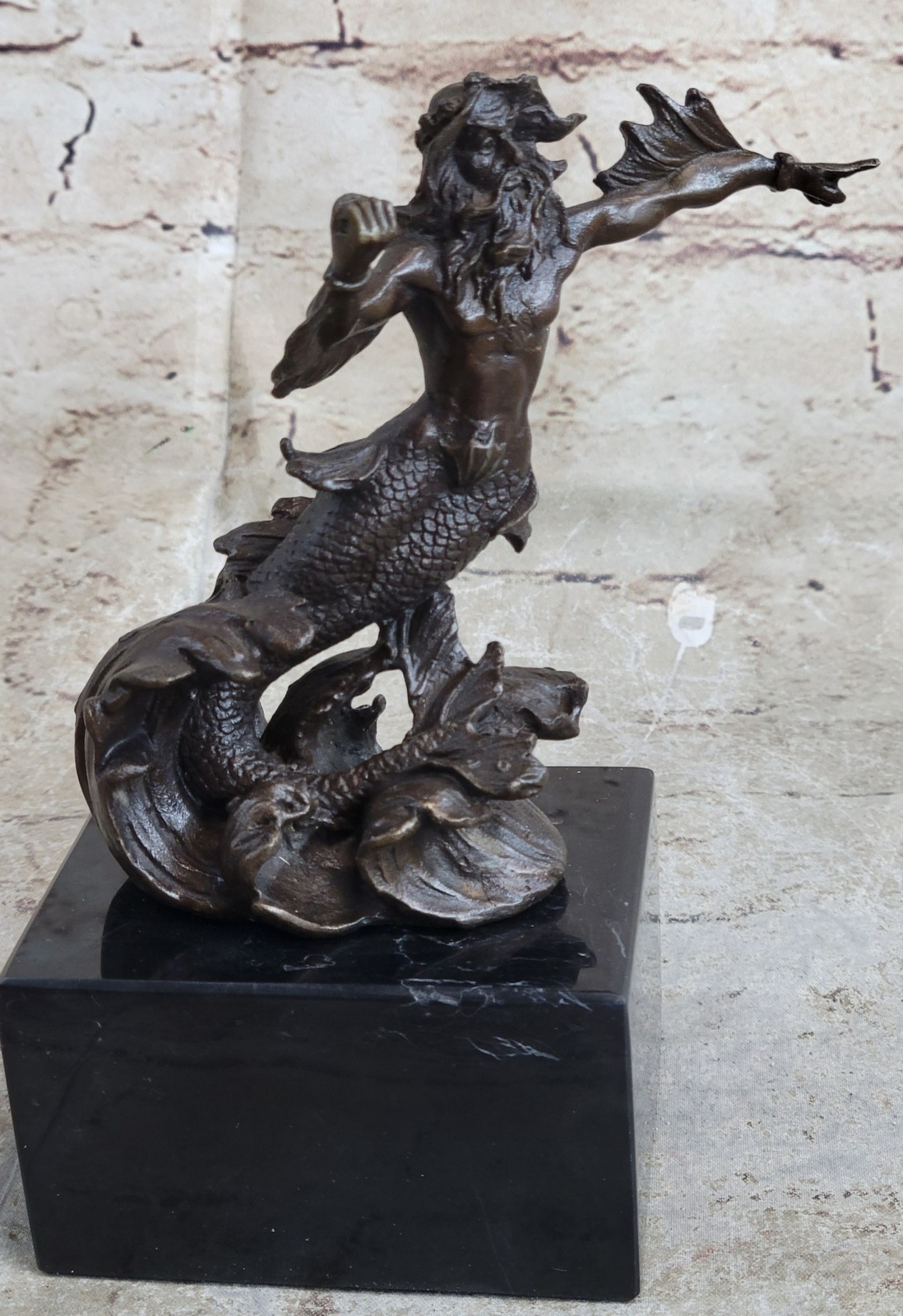 Signed Original Poseidon God of Sea Bronze Marble Base Figurine Home Decor Deal Signed Original Poseidon God of Sea Bronze Marble Base Figurine Home Decor Deal Condition : This sculpture is in perfect condition. Bronze Dimensions with Marble Base: Height 7" X Width 4" Marble Dimensions:4" X 3" Height without base:6" Weight:4 LBS Inventory:34XNCH0182243 This sculpture portrays Poseidon, the mighty god of the sea, storms, and earthquakes in Greek mythology, as a powerful merman wielding his iconic trident. Known for his tumultuous temperament and control over the oceans, Poseidon held significant importance in ancient Greek and Roman cultures, revered as a protector of cities and sailors alike. His complex character was depicted in various aspects, from benevolently creating new islands to wrathfully causing chaos and destruction. Crafted using the esteemed "Lost Wax Method," this sculpture exemplifies meticulous attention to detail, capturing the dynamic energy and strength of Poseidon as he brandishes his trident. The brown patina enhances the sculpture's lifelike appearance, while the marble base adds stability and elegance to its presentation. Signed by the artist Nick, this piece pays homage to the enduring legacy of Poseidon and his mythological significance. With its portrayal of Poseidon as a merman, this sculpture offers a unique interpretation of the deity, blending elements of human and sea creature to convey his divine power and authority over the maritime realm. Whether displayed as a centerpiece in a collection or as a standalone piece of art, it serves as a reminder of the awe-inspiring forces of nature and the enduring mythological narratives that continue to captivate our imagination. Signed Poseidon God of Sea Bronze Bookend Book End Sculpture Marble Base Statue XNCH-018 Video will open in a new window Using the eBay App? Paste link into a browser window: [isdntekvideo] Shipping Terms : Most of our items are shipped via USPS (United States Postal Service) mail or UPS. Most orders are shipped within 24-48 hours of purchase. Please be aware that not all items are available for USPS shipping due to size and weight. We do ship to Hawaii, Alaska, Canada, Puerto Rico, APO/AE, and U.S. Virgin Islands, however, an additional charge may be required. Please contact us before making any purchases in these areas. For Non-USA customers, you may be responsible for all duty, tax, brokerage fees that may be due upon delivery (shipping costs cover freight charges only). We also ship internationally. Please refer to the "Shipping and Handling" chart for the rates for each area. Payment : We accept just about any form of payment. PayPal, Master Card, Visa or American Express credit cards. Money orders, cashiers checks, and even personal or business checks. For governmental institutions, we will also accept a purchase order. Please understand that for personal or business checks we have to wait for the check to clear (usually 7 days) before shipping. Condition : New Detailed Hand Crafted Hot Cast Bronze Satisfaction Guaranteed. This is Stock Photo, Slight Color Variation!! Listing and template services provided by inkFrog