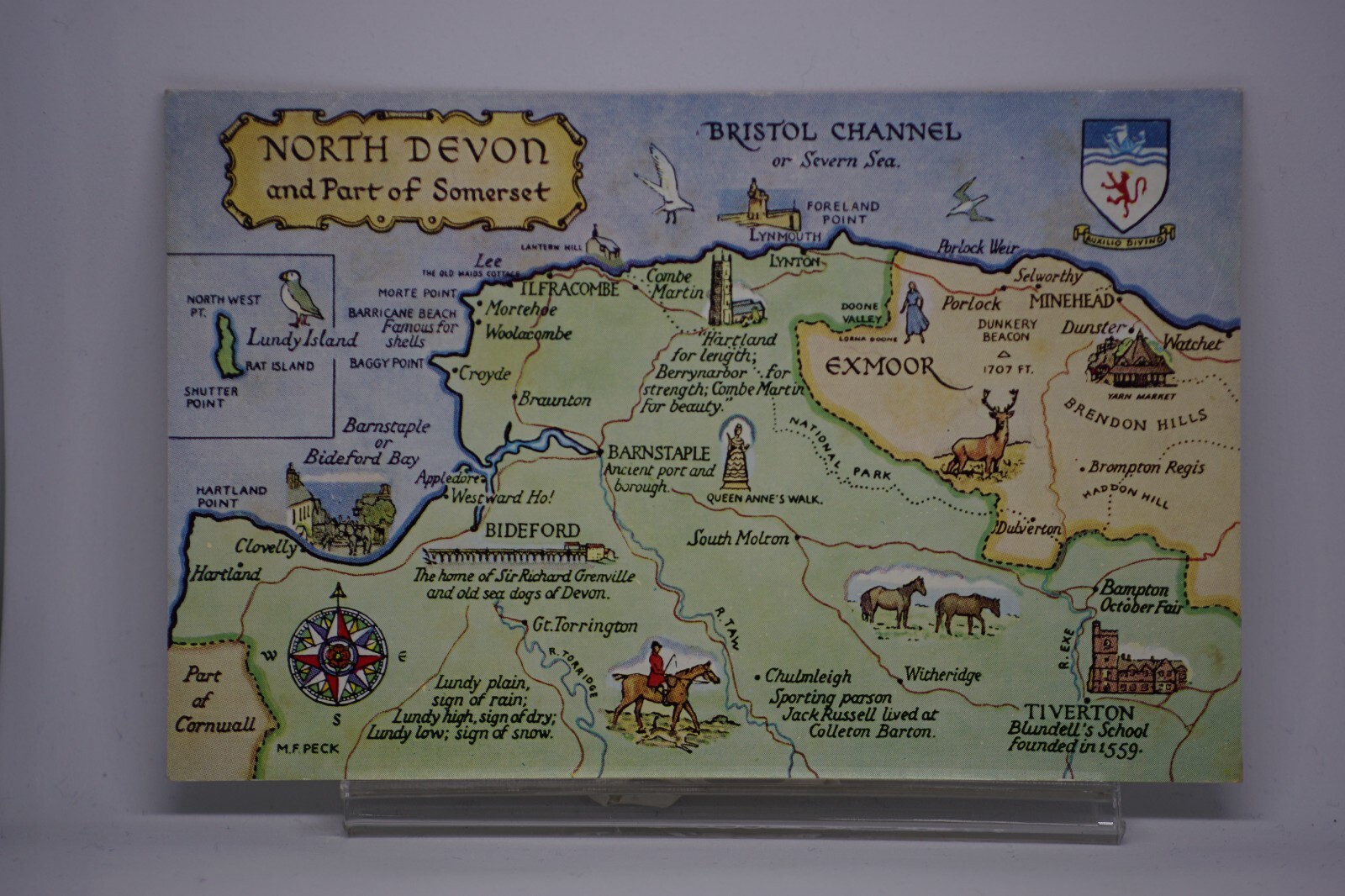 Postcard Comic Map North Devon Somerset England Bristol Channel M F Peck Salmon © J Salmon Limited Water Colour Series No. 4581 Unposted. Good vintage condition. Bending and creasing in multiple places across postcard. No visible damage to any of the edges. All corners slightly bent. Dirt spots, discoloration, creasing, scratches, missing paint and stains marks may be visible on single or both sides of the postcard. Good condition for its age. Please look at the photos for condition details. Keywords: Bridge Bridges Tourist River Rivers Scenic Main Street Aerial Bird's Eye Birds Eye Multi View Banner