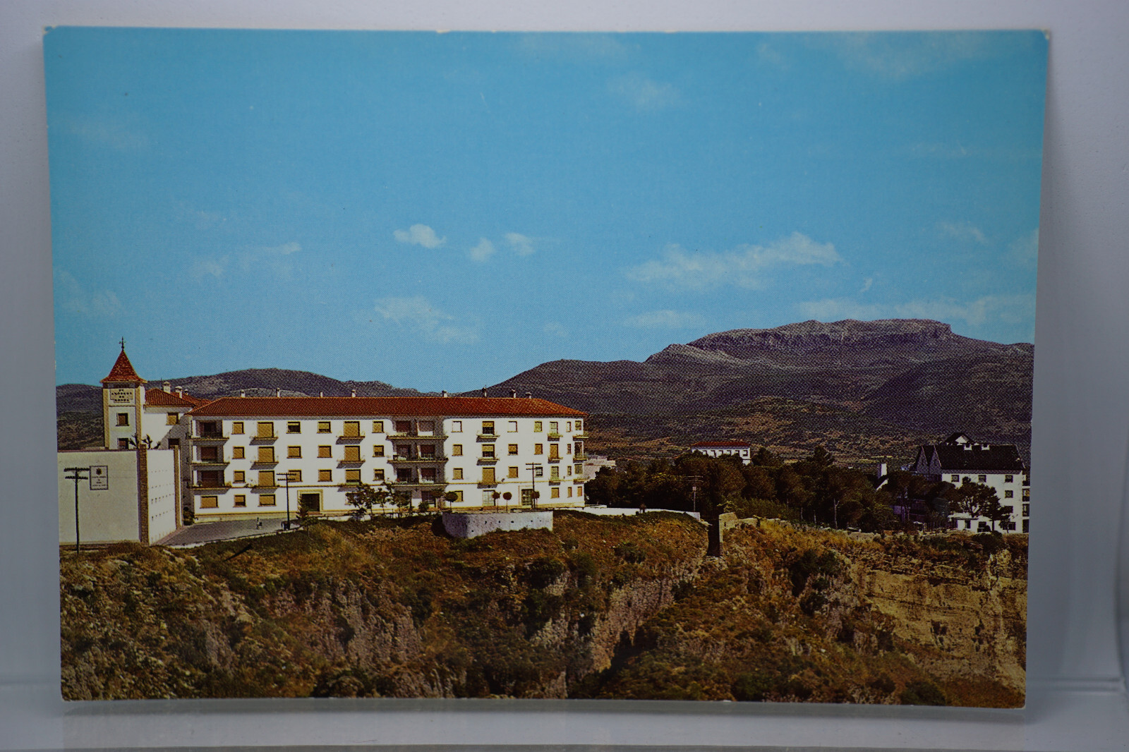 Postcard Spain Tajo Cliff-Sided Hotel Reina Victoria Wellness & Spa Ronda Malaga Unposted. Good vintage condition. Pencil writing at the back reading "SPAIN". No visible damage to any of the edges. All corners slightly bent. Age related dirt spots, discoloration, creasing, scratches, missing paint and stains marks may be visible on single or both sides of the postcard. Good condition for its age. Please look at the photos for condition details.