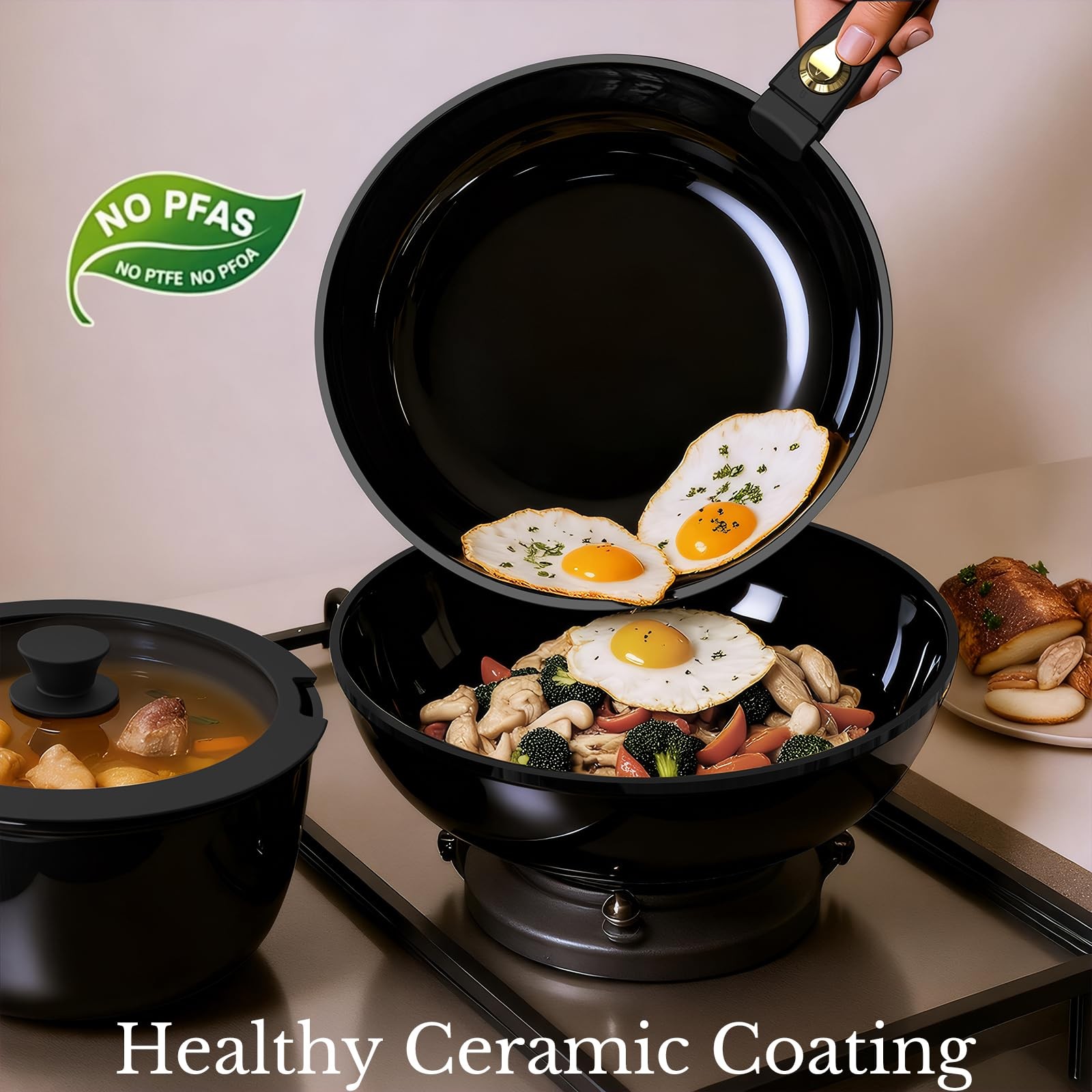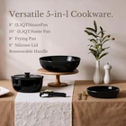 Ceramic For Healthy-Free Cooking: Made of natural ceramic, our kitchen ceramic cookware set is no Teflon and no PFAS, PFOA, lead, or cadmium.For a Clutter-free Cabinets: Optimal storage and easy stacking with the handles off saves up to 70% more space of detachable handle pots and pans set.—keeping the kitchen organized and tidy.For a Fuss-free Cleaning: Cleanup with ZERO elbow grease thanks to the non stick ability. 3S handwash and dishwasher safe.Multitaskig Cookware Set: Removable handle for the ultimate versatility– go from ALL kinds of stoves including gas, electric, induction etc to the oven, to the grill, to the fridge, and onto the table in a click.Perfect for compact kitchens and an ideal choice for RV or camping.You won't Compromise on Quality: Balanced convenience-rich features, rapid & even heat transfer, and nonstick performance as the same as other cookware sets Ceramic For Healthy-Free Cooking: Made of natural ceramic, our kitchen ceramic cookware set is no Teflon and no PFAS, PFOA, lead, or cadmium For a Clutter-free Cabinets: Optimal storage and easy stacking with the handles off saves up to 70% more space of detachable handle pots and pans set.—keeping the kitchen organized and tidy For a Fuss-free Cleaning: Cleanup with ZERO elbow grease thanks to the non stick ability. 3S handwash and dishwasher safe. Multitaskig Cookware Set: Removable handle for the ultimate versatility– go from ALL kinds of stoves including gas, electric, induction etc to the oven, to the grill, to the fridge, and onto the table in a click.Perfect for compact kitchens and an ideal choice for RV or camping You won't Compromise on Quality: Balanced convenience-rich features, rapid & even heat transfer, and nonstick performance as the same as other cookware sets