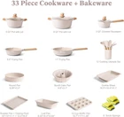 Unique & Convenient Design: The lid can be used in the frying pan or the soup pot, when you cook, you can watch the whole cooking process and master the progress of the whole cooking. The heat-resistant and anti-slip Ergonomic knob and handle are nice to grip, easy to maneuver, safe and anti-scald. Superior Quality: Excellent thermal conduction is one of the benefits of Aluminum bakeware- provides for even heat distribution through the baking process. Oven is safe for up to 450°. Great for amateur and advanced bakers alike! Have the Bakery in your kitchen! (Note: Bakelite of pans is not suitable for ovens) No Bending or Popping Bakeware Set: Incredibly durable bakeware; high quality and ultra durable carbon steel is superior to others; resists warping, popping, and bending, even in high temperatures, while helping to maintain even heat distribution for picture perfect results every time, rust and scratch resistant and designed to last a ; do not use on broil or over an open flame. Safety Non-Stick Granite Coating: The nonstick pans and pots set are made with a stone-derived nonstick coating inside out to deliver unprecedented nonstick performance - everything just slides right off with less oil & cleans up easily. The natural mineral nonstick coating is ultra-durable while remaining 100% free of PFOA, PTFA, lead, and cadmium. Healthy Nonstick Pans and Pots Set: The 33 piece kitchen pots and pans include a 9.5” frying pan, an 11" frying pan, a 5QT stockpot with lid, an 8QT stockpot, a 3QT saucepan with lid, 11 Kitchen utensils set, a storage bucket, a boundform pan, a round pan, a cookie sheet, a roaster pan+cooking pack, loaf pan, muffin pan and six sponges. The stylish cookware sets meet all your kitchen and family needs. On Dec 15, 2024 at 18:42:58 PST, seller added the following information: