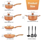 11 Piece Cookware Set - Includes 2 piece skillet set: 8" Frying pan & 9.5" Frying pan, 3 QT saute pot with lid, 2 piece saucepan set: 2 QT saucepan with lid &1.5 QT saucepan with lid, and 3 kitchen utensils, meeting your various demands of everyday cooking. Portable gift box packing for your gift choice. All pots/pans already assembled---it's a terrible experience for user to assemble by himself Heating Technology - The pots and pans set is suitable for a wide range of heating sources. Induction bottom cooks food evenly, compatible with gas or electric griddle and modular stoves or halogen cooktop. Low to medium heat is recommended. Note: Remember not to leave scoop in pan and heat without water Ceramic Non-stick Coating - All the copper pots and pans set are Ceramic coating both inside and outside providing superior non-stick performance. 100% free of PTFE/ PFOA/ lead/ cadmium. Non-stick Pans and Pots helps you cook food with less oil, and super easy to clean. - Enjoy healthy and happy life with our kitchenware set! Beautiful & Elegant Kitchen Pot and Pan Set - This pan set is aesthetically made for cooking presentable meals. Bright Copper color add vitality to your kitchen. Confidently invite friends and family for parties, Thanksgiving and Christmas Ergonomic Design - pot set features comfortable handles and tempered glass lids. - Handles were designed for comfort and safety, featuring non-slip, heat-resistant and easy-to-grip. Vented tempered glass lids can handle over 350°F. See-through clear lid provides convenience for observing food cooking