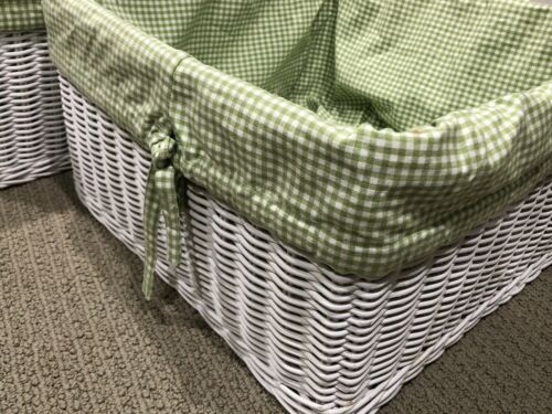 Pottery Barn Kids Baskets (Set of 2) With Liners. Baskets are white, liners are green/white check gingham. Solid, good condition, clean but not perfect. Size: 17"x17" and 9" tall Local Pickup Only at: 01983