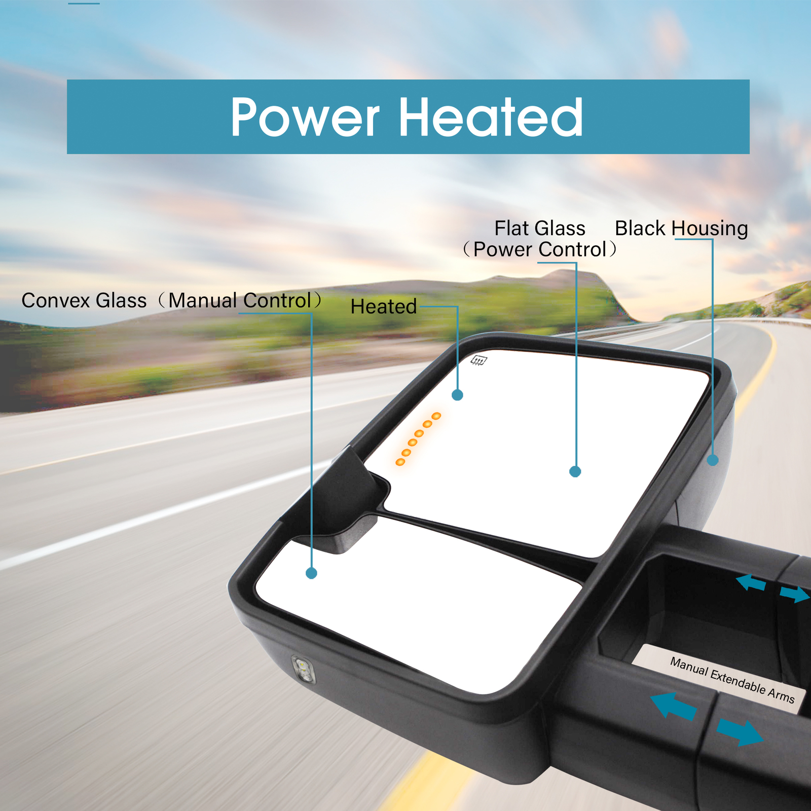 Product Description Detailed description of the product Specifications : Condition New Connector 2 Plug Fold Away Manual Fold Warranty 1 Year Color Black Location Passenger Right + Driver Left Side Features: LED Turn Signal Light Arrow Light On Glass Heating Power Adjustment Mirrors Glass Heating Element to Defrost Mirrors Auxiliary Light (reserved,need to wire realize) Arrow Light Puddle Light (reserved,need to wire realize) Manual extended telescoping wide angle mirrors (provide a better angle and parking in tight spots) Fits: 2007 2008 2009 2010 2011 2012 2013 Chevrolet Avalanche 2007 2008 2009 2010 2011 2012 2013 Chevrolet Silverado 1500 2007 2008 2009 2010 2011 2012 2013 2014 Chevrolet Silverado 2500 3500 2007 2008 2009 2010 2011 2012 2013 2014 Chevrolet Suburban 1500 2500 2007 2008 2009 2010 2011 2012 2013 2014 Chevrolet Tahoe 2007 2008 2009 2010 2011 2012 2013 GMC Sierra 1500 2007 2008 2009 2010 2011 2012 2013 2014 GMC Sierra 2500 3500 2007 2008 2009 2010 2011 2012 2013 2014 GMC Yukon 2007 2008 2009 2010 2011 2012 2013 2014 GMC Yukon XL 1500 2007 2008 2009 2010 2011 2012 2013 GMC Yukon XL 2500 Note : These mirrors will only work properly on vehicles with these exact options. If your vehicle does not have the options listed, these mirrors may not function properly. No installation guide. Professional installation is highly recommended. In the event the item should fail due to manufacturing defects during intended use, we will replace the part by free.(1 Year Warranty) If you encounter any problems, please contact us and we will provide you with solutions. Thank you! Payment Shipping Returns Contact Us PayPal is our preferred method of payment for all of our eBay sales. For customer service please contact us via eBay MessagesImmediate payment via PayPal is required for all Buy It Now items. If you need special arrangements, please contact us through eBay messages. Generally, all goods will be shipped within 24 hours after the payment on the working day (except for goods sent from China). If you want to cancel the order or change the address, please contact us within 6 hours after payment, otherwise we will not be responsible. It takes 3-5 working days for logistics and transportation to be delivered. If you are not satisfied with your purchase, you may return it, for a refund or replacement - subject to the following: Contact us through eBay messages or the returns link to receive a Returned Merchandise Authorization (RMA) number to ensure proper handling of the return and/or replacement. In order to be eligible for a full refund, less shipping expenses, your returned merchandise must be in its original new condition, as shipped, with all packaging, manuals, and paperwork intact and unaltered. Items which have been opened are returnable, however they will carry a restocking fee. If that product is returned for a refund, the shipping expenses incurred, will be deducted from the refund. If an item is refused, the carrier bills us for shipping both ways, and these expenses incurred on your behalf need to be deducted from your refund If you have a question about a part you should contact us before buying.And If you have any questions after purchase, please contact us and we will provide a satisfactory solution. Payment PayPal is our preferred method of payment for all of our eBay sales. For customer service please contact us via eBay MessagesImmediate payment via PayPal is required for all Buy It Now items. If you need special arrangements, please contact us through eBay messages. Shipping Generally, all goods will be shipped within 24 hours after the payment on the working day (except for goods sent from China). If you want to cancel the order or change the address, please contact us within 6 hours after payment, otherwise we will not be responsible. It takes 3-5 working days for logistics and transportation to be delivered. Returns If you are not satisfied with your purchase, you may return it, for a refund or replacement - subject to the following: Contact us through eBay messages or the returns link to receive a Returned Merchandise Authorization (RMA) number to ensure proper handling of the return and/or replacement. In order to be eligible for a full refund, less shipping expenses, your returned merchandise must be in its original new condition, as shipped, with all packaging, manuals, and paperwork intact and unaltered. Items which have been opened are returnable, however they will carry a restocking fee. If that product is returned for a refund, the shipping expenses incurred, will be deducted from the refund. If an item is refused, the carrier bills us for shipping both ways, and these expenses incurred on your behalf need to be deducted from your refund Contact Us If you have a question about a part you should contact us before buying.And If you have any questions after purchase, please contact us and we will provide a satisfactory solution. Related Products Pair Tow Mirrors Power Heated Turn Signal For 2015-2018 Chevrolet Silverado 2500 Tow Mirrors Power Heated Fits 2014-2018 Chevy Silverado GMC Sierra LH RH Chrome Towing Mirrors Power Heated For 2007-2013 Chevy Suburban 1500 2500 LH RH Chrome Towing Mirrors Manual Fold For 2009-2012 Chevy Silverado 2500 3500 LH+RH Black Pair Tow Mirrors Power Heated Fits 99-02 Chevy Silverado GMC Sierra 1500 Black Pair Tow Mirrors Power Heated LED Signal Fits 2004-2006 Chevy Tahoe Suburban Heated √ √ √ NO √ √ Power √ √ √ NO √ √ Turn Signal Light √ √ √ NO √ √ temperature sensor NO NO NO NO NO NO Puddle Light √ √ √ NO √ √ Arrow Signal Light √ √ √ NO √ √ housing color Black Chrome Chrome Black Black Black folding Manual Manual Manual Manual Manual Manual fit for 14-18 Chevy Silverado 1500 15-18 Chevy Silverado 2500 3500 14-18 GMC Sierra 1500 15-18 GMC Sierra 2500 3500 14-18 Chevy Silverado 1500 15-18 Chevy Silverado 2500 3500 14-18 GMC Sierra 1500 15-18 GMC Sierra 2500 3500 07-13 Chevy Avalanche