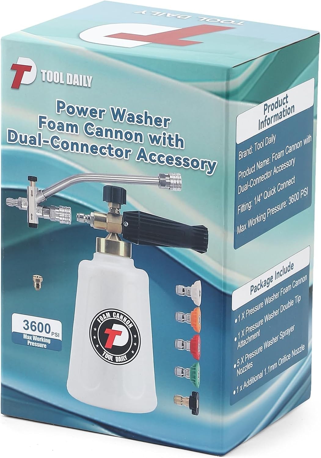 ππππ-πππππ πππππππππ: This foam cannon dual connector features two connector ends - one longer end for the pressure wash nozzle and one shorter end for the snow foam lance. It enables uninterrupted water flow while using the nozzle, even when the foam dispenser is attached. ππ π πππππππ ππππππ: The two-way shuttle valve is designed to effortlessly switch between snow foam lance and pressure washer tip tasks, eliminating the need for constant disassembly or replacement. This innovative design saves time and reduces the hassle of changing attachments for different cleaning tasks, making it a versatile and convenient tool for any cleaning routine. ππππππππ πππ ππ π ππππππ: Our upgraded dual spray foam cannon is specifically designed to optimize foam spraying. The container bottle now features a larger mouth, making it effortless to fill with your desired foam solution. Moreover, it boasts an extra-wide neck, ensuring a crack-free experience. πππππππππππ ππππ πππ ππππππ: An additional 1.1mm orifice nozzle is included for improved performance. When the working pressure is below 2500 PSI, this nozzle creates thicker foam compared to the original one. Please utilize the original nozzle if the working pressure exceeds 2500 PSI. πππππππππππ: Ideal for motorcycle and car washing, cleaning roofs, driveways, and siding, as well as washing floors and windows, it proves to be the ultimate product for detailing trucks or SUVs. Experience a new dimension of cleanliness with our innovative foam blaster dual-connector accessory.