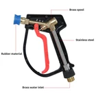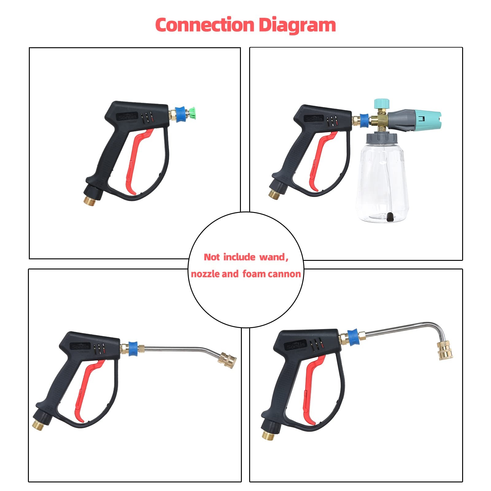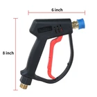 Best Choice: Whether you need economical products or higher performance products, pressure car wash equipment can provide a reliable choice. Bring you high-quality products, let you rest assured to use and complete your work easily and happily. Specification: 1. Max Pressure is up to 4000 PSI. 2. Material: stainless steel and plastic. 3. Interface: 1/4 inch outlet quick connector, M22-14 thread inlet. Warnings and precautions: 1.Please keep an eye for this. The short handle pressure washer gun are not suitable for garden hoses and faucets. 2. The inlet size of the gun is M22-14. If the inside diameter of the pressure washer hose is M22-15, a brass fitting is required to connect the gun to the hose. If the size is wrong, it will cause water leakage. 3.Before disconnecting the gun from the high pressure hose, turn off the high pressure washer and pull the trigger to release the pressure. How to maintain: Blow dry, wipe dry or natural air dry, dry preservation, can extend the service life of the pressure washer gun. ❤【High Quality Craftsmanship】The inside of the high pressure washer gun is made of stainless steel and high-quality ceramic triggers, and the outside is made of sturdy engineering plastic, which is rust-proof and leak-proof, and durable. ❤【Compatibility】Short handle pressure washer gun is equipped with 1/4 quick connector, easy to connect foam cannon, nozzle, wand, etc. The inlet size of the gun is an anti-winding M22-14 interface. Effectively prevent the inconvenience caused by the entanglement of the hose during use. ❤【Attention】Not suitable for garden hoses, water pipes or faucets, only suitable for high pressure washer. The trigger gun has a red safety locking handle to prevent accidental spraying. ❤【Multiple scene applications】Power washer gun applied to car washing, roofs, driveways, floors, even watering flowers. pressure washer gun is a good partner in your life. ❤【Quality Assurance】Any problem,feel free to contact us. The professional team is always ready to serve you.