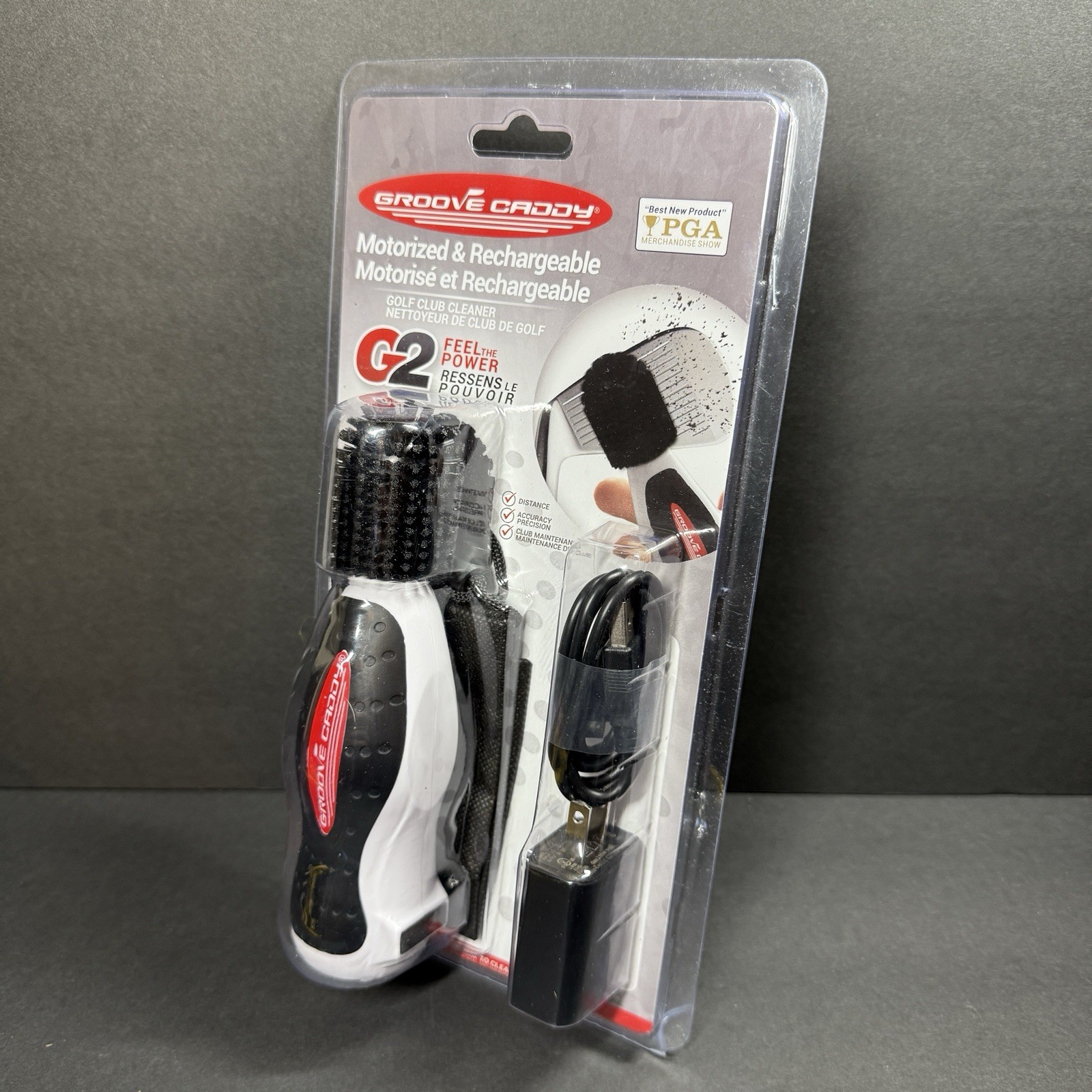 Enhance your golfing experience with the Groove Caddy G2 Motorized Golf Club Cleaner. This innovative accessory is designed to make cleaning your clubs a breeze, so you can focus on your swing. Its rechargeable feature ensures you always have the power you need to keep your clubs spotless on the course. The sleek grey design of the Groove Caddy G2 is both stylish and functional, easily fitting into your golf bag for convenient access. Whether you're a seasoned golfer or just starting out, this is an essential tool for maintaining your gear.