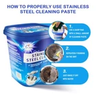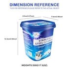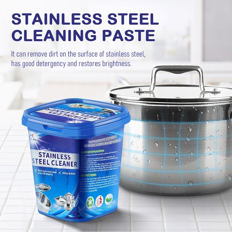 一、Functions Remove rust and scorch marks This cleaner can effectively remove rust and scorch marks on the surface of stainless steel, making it shiny again. Cleaning and polishing It has the functions of cleaning and polishing the surface of stainless steel, making stainless - steel utensils look brighter and cleaner. 二、 Scope of application It is suitable for kitchen utensils, etc. This means it can be used to clean common stainless - steel products such as stainless - steel pots, bowls, plates, and sinks. 三、Packaging design The packaging uses blue as the main color, with a barrel - shaped design and a blue lid on the top. There is relevant product information on the front and sides, which is convenient for consumers to understand the functions and usage methods of the product. Overall, this stainless - steel cleaner is mainly for the cleaning and maintenance of stainless - steel products. It can solve the problems of rust and scorch marks on the surface of stainless steel, keeping stainless - steel utensils shiny.