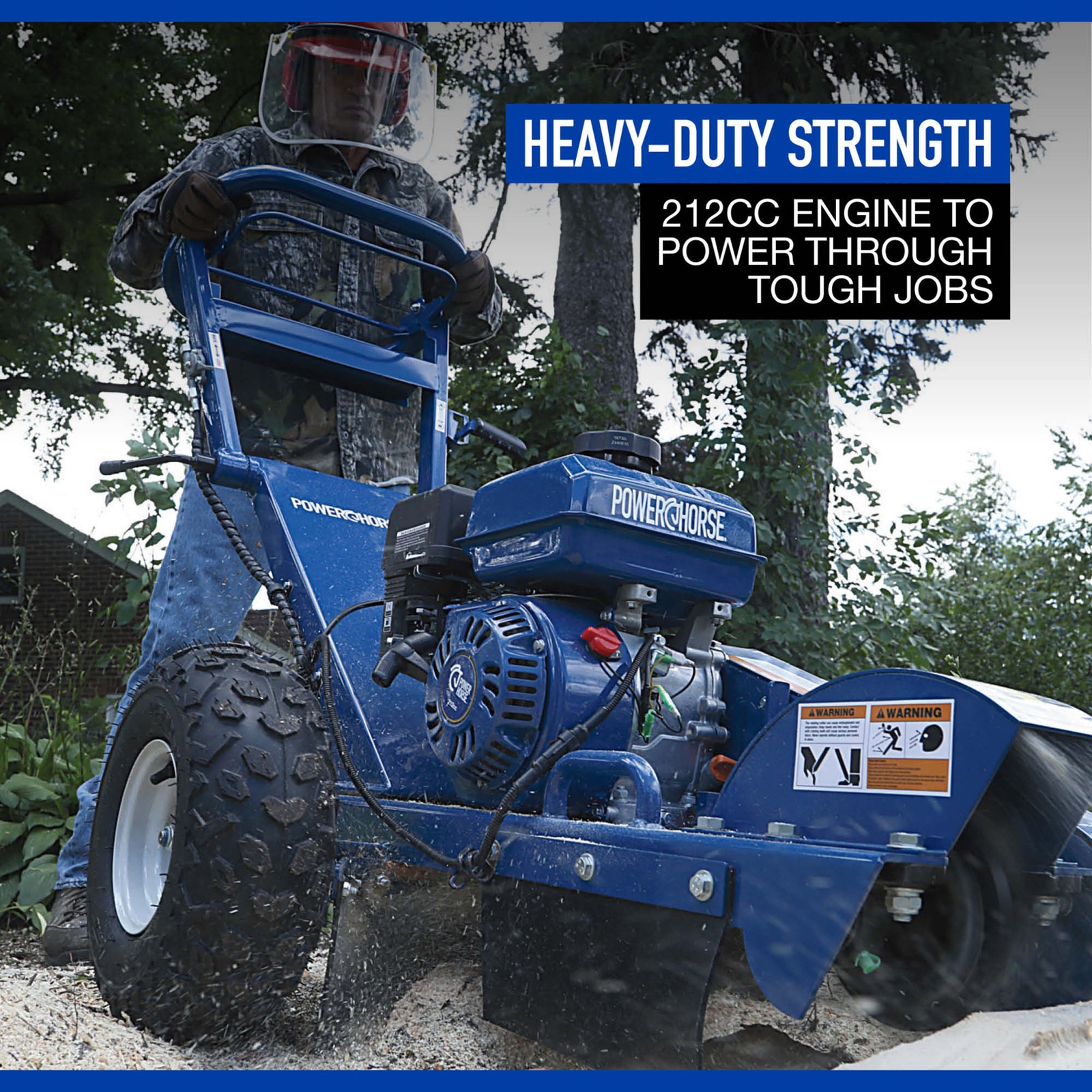 The Powerhorse 7 HP stump grinder is a super handy, lightweight, easy-to-operate machine specifically designed to make quick work of grinding small tree stumps and roots. The dependable 212cc Powerhorse 4-stroke gas-powered engine quickly comes to life, generating impressive power to get the job done. This grinder can handle the most rugged jobs, relying on its 10in. dia. cutting wheel with 6 long-lasting, carbide-tipped teeth to chew through stumps and roots quickly and easily until there's nothing left. These carbide-tipped grinding teeth can be resharpened over and over, ensuring the grinder’s performance stays at the top of its game. A strong steel frame withstands rugged work and is combined with a compact wheelbase of only 78 cm, making access Powerhorse 7 HP Stump Grinder, 212cc Gas-Powered Engine, 6 Carbide-Tipped Teeth Northern Tool Item# 5858444 Item Weight: 167.0000 lb(s) Manufacturer: MPN: Warranty: . Product Summary: The Powerhorse 7 HP stump grinder is a super handy, lightweight, easy-to-operate machine specifically designed to make quick work of grinding small tree stumps and roots. The dependable 212cc Powerhorse 4-stroke gas-powered engine quickly comes to life, generating impressive power to get the job done. This grinder can handle the most rugged jobs, relying on its 10in. dia. cutting wheel with 6 long-lasting, carbide-tipped teeth to chew through stumps and roots quickly and easily until there's nothing left. These carbide-tipped grinding teeth can be resharpened over and over, ensuring the grinder’s performance stays at the top of its game. A strong steel frame withstands rugged work and is combined with a compact wheelbase of only 78 cm, making access into even the tightest locations a breeze. A locking hand brake keeps the unit well balanced during operation, and the adjustable handlebar allows you to always keep the grinder at the perfect, most comfortable working height. Payment Instructions You can pay us securely through eBay. All orders will contain an invoice/receipt. IMPORTANT: We will not honor requests to remove invoices or receipts from packages. No exceptions ON U.S. PURCHASES, Northern currently collects sales tax on purchases shipped to all states except: Alaska, Delaware, Montana, New Hampshire, Oregon Shipping Information This product will be shipped by Parcel. Parcel Shipping: Ground shipped items must be sent to a physical address and cannot be sent to a PO box. If a PO box address is submitted without a physical address, it may delay your order. We cannot ship to APO/FPO boxes. Please note that we do not ship items on weekends or holidays. More information on shipping and handling times can be found on our Store Policies Page . Customer Care We want you to be satisfied with your purchase; please notify us by email if you have any concerns. Before you send an email message, please check our Help Section . We may already have an answer to your question! We are available to answer your email questions Monday through Friday from 8am - 3pm CST, excluding holidays. If your email is sent on a weekend, holiday or after business hours, we will respond to you on the following business day. Returns may be accepted on most items within 30 days of receipt of the item. All returns require authorization from us. Some returns are charged a 15% restocking fee. Please click the Shipping and Payments tab on this item for specific return information and full details. About Our Products Product Warranty: Warranty information and contact details can be found on our Store Policies Page. We are working hard to ensure that the information provided on the eBay product advertisements is accurate and up-to-date. We reserve the right to correct ad errors and/or omissions. Pricing and availability is subject to change without notice. Yes