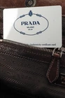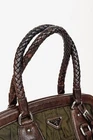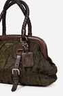 This Italian-made shoulder bag from Prada's 2007 Resort collection is crafted with the designer's Tessuto Gaufre nylon in an army green, and features dark brown leather trim, silver-tone hardware, two braided leather handles, a structured frame, buckled detailed straps, and a removable tag. Secured with magnetic snap closures, the top opens to a black logo-jacquard-lined interior containing a slip pocket, and a zip pocket. Condition: Excellent; some scratching and wear on leather trim, minimal wear on nylon exterior and interior. Comes with dustbag. Approximate measurements: Height: 9.25" (23.5 cm) Width (bottom, top): 14", 12.5" (35.5 cm, 32 cm) Depth: 4.5" (11 cm) Handle Drop: 6.5" (16.5 cm) Composition: Nylon, leather trim, fabric lining, metal hardware.