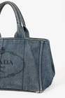 Made in Turkey, this Canapa tote from Prada is crafted with a sturdy denim in an Avio blue, and features gold-tone hardware, two top handles, snap-closure side gussets, protective bottom feet, the designer's logo printed on the front; and a spacious interior containing three slip pockets, and two zip pockets. Condition: Very good; some discolouration on exterior and inner top edge, some distressing on handles and corners, some wear on bottom feet, some wear on inner leather tabs. Comes with authenticity card. Approximate measurements: Height: 8.5" (21.5 cm) Width: 13" (33 cm) Depth: 8.25" (21 cm) Handle Drop: 6.75" (17 cm) Composition: Denim, metal hardware.
