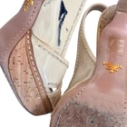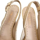 Prada Beige Patent Leather Cork Platform 4 inch Open Peep Toe High Heels Pump Sandal Shoes Size 37 1.5 inch Platform, 4 inch Heels. Patent Leather, with Woven Stitch. Cork Footbed. Size 37 ; US6.5 Flaws: Marker Stains on inner arch area (Can be removed) Prada Patent Leather Platform Open Toe Sling Back High Heels in Beige are a designer shoe for women. They have a solid pattern with a peep toe and buckle closure. The heel style is stiletto and the heel height is high (3-3.9 in) with a 1.5 in platform height. The shoe is made of patent leather with a cork outsole and leather lining and insole material. It features an ankle strap and adjustable strap. These shoes are suitable for travel, party/cocktail, and casual occasions.