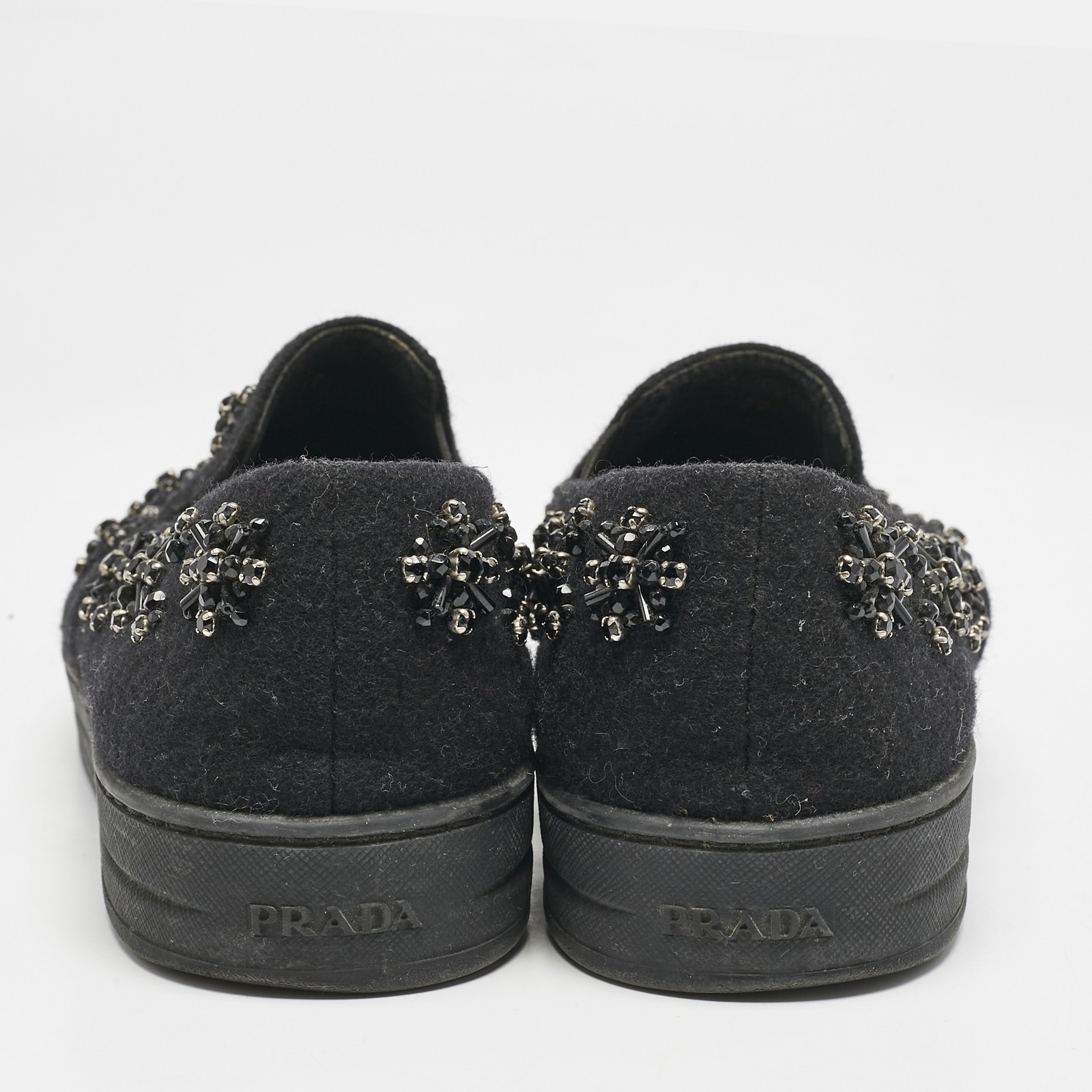 Sleek and luxe, these slip on sneakers by Prada will enhance your outfits by giving them an edge. Meticulously crafted from felt, they carry a classic black hue and crystal embellishments all over.Certified by The Luxury Closet - This item has gone through a detailed authentication process overseen by our experts. We offer a lifetime guarantee of authenticity on all our items. Import duties, taxes and charges are not included in the item price. These charges are the buyers responsibility. Please check with your country’s customs office to determine what these additional cost will be prior to buying. Our eBay Store About Us Contact Us Add to Favorite Sellers Prada Black Felt Crystal Embellished Slip On Sneakers Size 39 $200.2 Sleek and luxe, these slip on sneakers by Prada will enhance your outfits by giving them an edge. Meticulously crafted from felt, they carry a classic black hue and crystal embellishments all over. Product Details Brand Color Black Dimensions Material Felt Size 39 Outsole Width 9 cm Outsole Length 28 cm Heel Height Includes The Luxury Closet Packaging Certified by The Luxury Closet This item has gone through a detailed authentication process overseen by our experts. We offer a lifetime guarantee of authenticity on all our items. How We Check The in-house team of experts at The Luxury Closet is highly trained to verify the authenticity and the condition of the luxury products. They ensure that only 100% authentic items are put on sale.The evaluation process is unique with its own mix of assessment criteria and differs according to the category. Each item is evaluated based on the following combination of hallmarks, hardware, stitching, symmetry, material, craftsmanship, stamping, codes, hologram stickers, and packaging. Our authenticators also check if the items have been modified or amended (e.g., aftermarket diamonds, replaced batteries, repaired bags, etc.) International Buyers Import duties, taxes and charges are not included in the item price. These charges are the buyers responsibility. Please check with your country’s customs office to determine what these additional cost will be prior to buying.