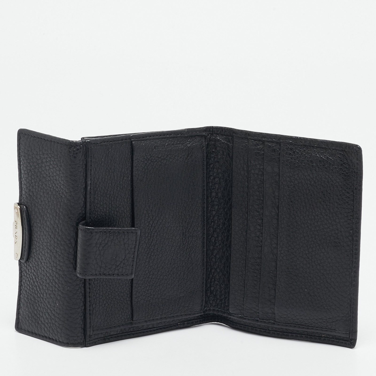 Sleek and sophisticated, this Prada compact wallet is crafted from smooth black leather. With a minimalist design and cleverly organized interior, its the ideal accessory for those who appreciate timeless style and everyday practicality.Certified by The Luxury Closet - This item has gone through a detailed authentication process overseen by our experts. We offer a lifetime guarantee of authenticity on all our items. Import duties, taxes and charges are not included in the item price. These charges are the buyers responsibility. Please check with your country’s customs office to determine what these additional cost will be prior to buying. Our eBay Store About Us Contact Us Add to Favorite Sellers Prada Black Leather Compact Wallet $258.5 Sleek and sophisticated, this Prada compact wallet is crafted from smooth black leather. With a minimalist design and cleverly organized interior, its the ideal accessory for those who appreciate timeless style and everyday practicality. Product Details Brand Color Black Dimensions Material Leather Size Outsole Width Outsole Length Heel Height Includes Certified by The Luxury Closet This item has gone through a detailed authentication process overseen by our experts. We offer a lifetime guarantee of authenticity on all our items. How We Check The in-house team of experts at The Luxury Closet is highly trained to verify the authenticity and the condition of the luxury products. They ensure that only 100% authentic items are put on sale.The evaluation process is unique with its own mix of assessment criteria and differs according to the category. Each item is evaluated based on the following combination of hallmarks, hardware, stitching, symmetry, material, craftsmanship, stamping, codes, hologram stickers, and packaging. Our authenticators also check if the items have been modified or amended (e.g., aftermarket diamonds, replaced batteries, repaired bags, etc.) International Buyers Import duties, taxes and charges are not included in the item price. These charges are the buyers responsibility. Please check with your country’s customs office to determine what these additional cost will be prior to buying.