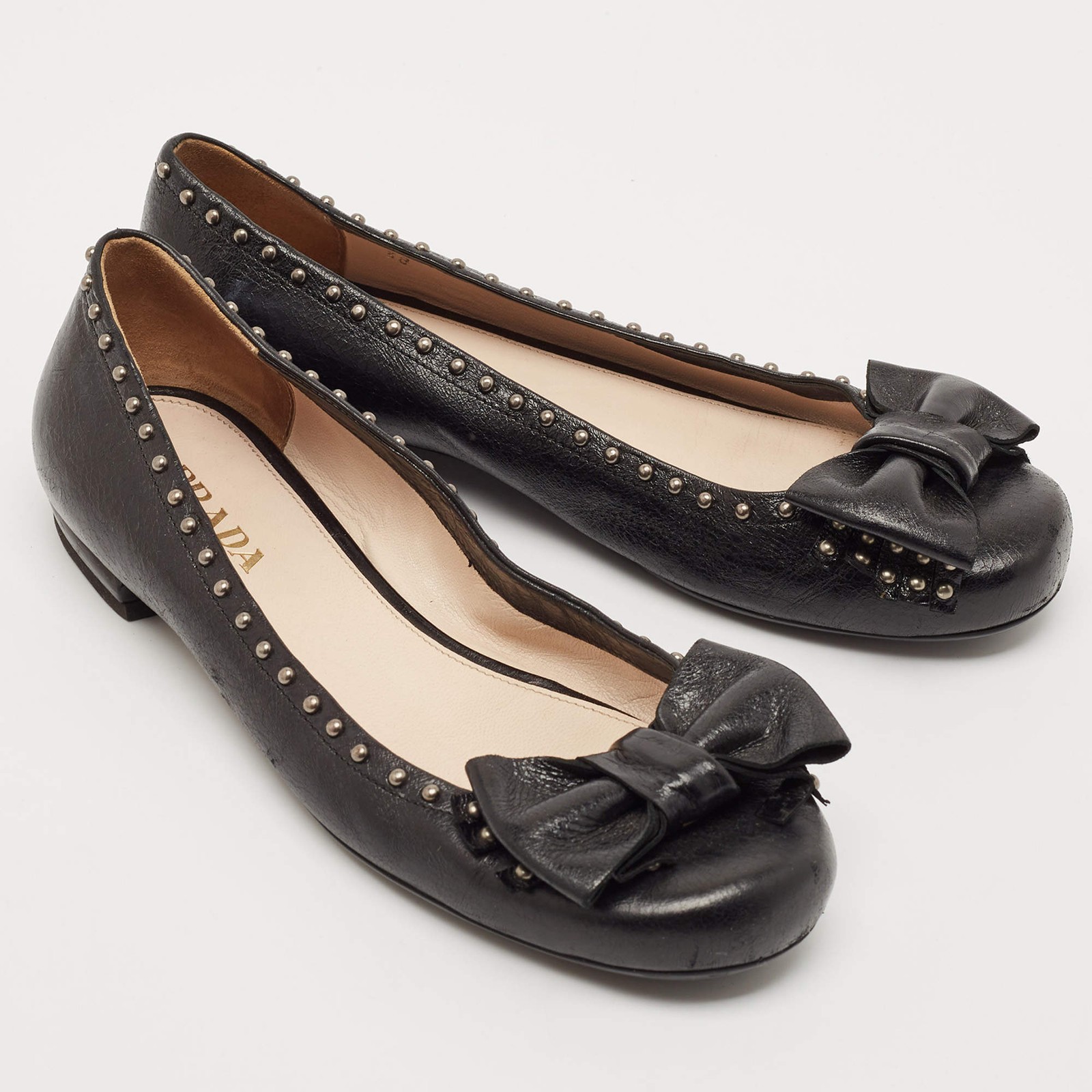 Our eBay Store About Us Contact Us Add to Favorite Sellers Prada Black Leather Logo Bow Ballet Flats Size 38 These ballet flats by Prada are perfect to be paired with any outfit of your choice. They have been crafted from patent leather and come in a classic shade of black. They are styled with round toes, gunmetal-tone detailing on the uppers, small bows and leather & rubber soles. Product Details Brand Prada Color Black Includes The Luxury Closet Packaging Outsole Length 26 cm Outsole Width 8 cm Size 38 Certified by The Luxury Closet This item has gone through a detailed authentication process overseen by our experts. We offer a lifetime guarantee of authenticity on all our items. How We Check The in-house team of experts at The Luxury Closet is highly trained to verify the authenticity and the condition of the luxury products. They ensure that only 100% authentic items are put on sale.The evaluation process is unique with its own mix of assessment criteria and differs according to the category. Each item is evaluated based on the following combination of hallmarks, hardware, stitching, symmetry, material, craftsmanship, stamping, codes, hologram stickers, and packaging. Our authenticators also check if the items have been modified or amended (e.g., aftermarket diamonds, replaced batteries, repaired bags, etc.) International Buyers Import duties, taxes and charges are not included in the item price. These charges are the buyers responsibility. Please check with your country’s customs office to determine what these additional cost will be prior to buying.