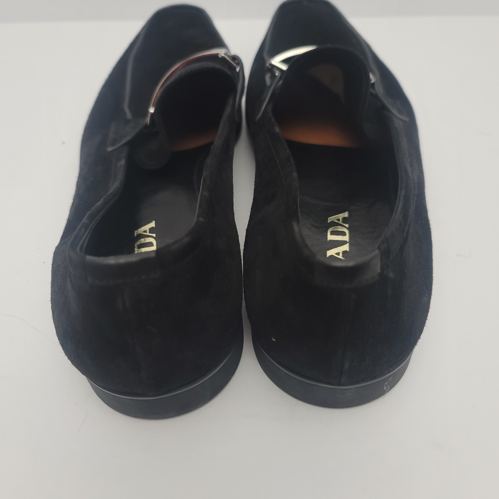 The product is a pair of Prada loafers in black, size 11 for men. Made in Italy, these casual shoes feature a faux suede upper material and leather insole for comfort and durability. With a classic loafer style, these shoes are perfect for casual occasions and everyday wear, showcasing the renowned quality and craftsmanship of the Prada brand.