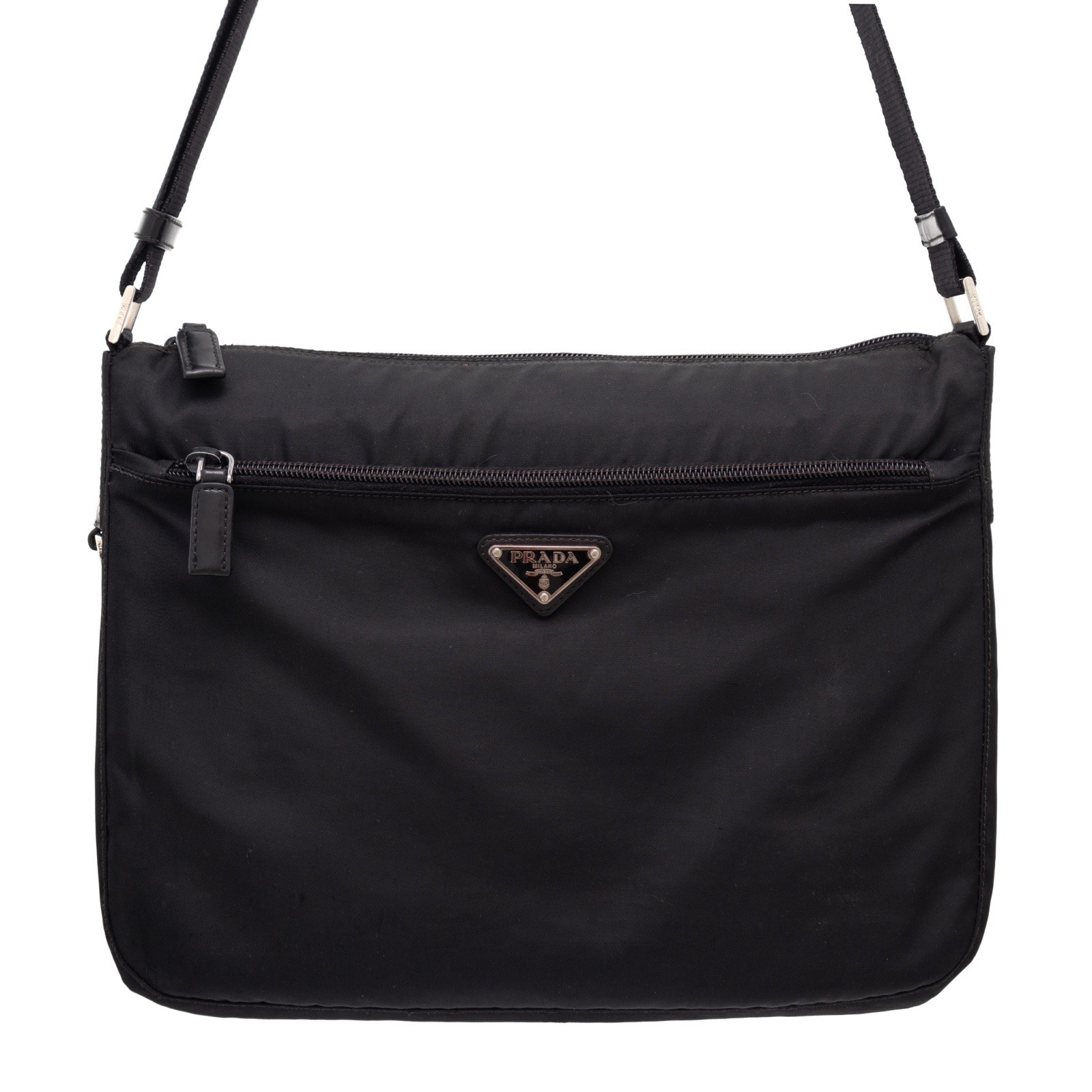 Prada Triangle Logo Tessuto Nylon Black Crossbody Camera Bag - SIZE: - Shoulder Strap Drop: 22.25" - Height: 9.75" - Width: 12.25" - Depth: 2.75 - 8/10 Very Good Preowned Condition - 100% Authentic - Made In Italy - Prada Messenger Bag - Black Nylon - Enameled Metal Triangle - Silver-Tone Hardware - Leather Trim - Single Adjustable Shoulder Strap - Leather Trim Embellishment & Single Exterior Pocket - Logo Jacquard Lining & Single Interior Pocket - Zip Closure at Top