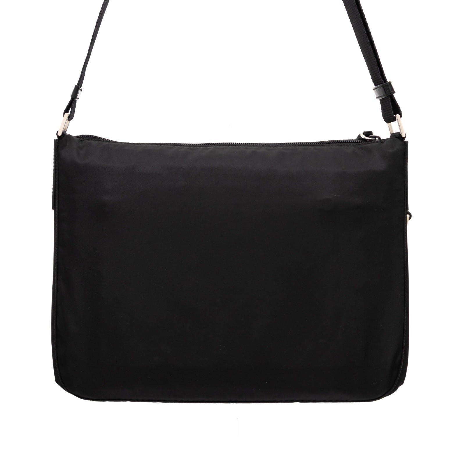 Prada Logo Tessuto Nylon Black Crossbody Bag - SIZE: - Shoulder Strap Drop: 22.25" - Height: 9.75" - Width: 12.25" - Depth: 2.75 - 8/10 Very Good Preowned Condition - 100% Authentic - Made In Italy - Prada Messenger Bag - Black Nylon - Enameled Metal Triangle - Silver-Tone Hardware - Leather Trim - Single Adjustable Shoulder Strap - Leather Trim Embellishment & Single Exterior Pocket - Logo Jacquard Lining & Single Interior Pocket - Zip Closure at Top
