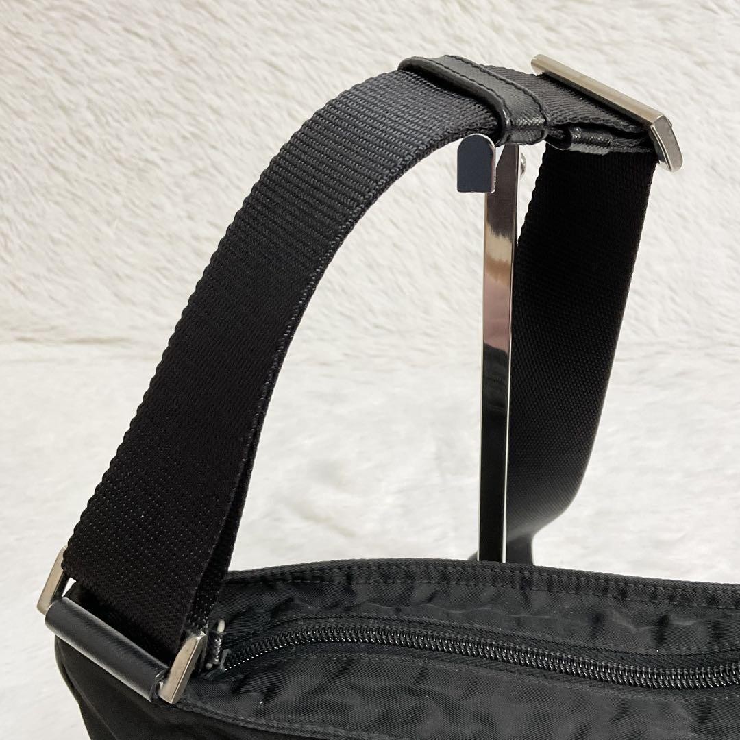 This Prada shoulder bag is sleek and versatile—perfect for everyday use. The black nylon and Saffiano leather give it a luxurious yet durable feel, while the silver hardware adds a polished touch. The spacious interior fits essentials easily, and the adjustable strap makes it comfortable to wear crossbody. No visible flaws, just timeless style. Ships fast, great for both men and women!