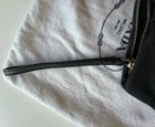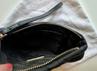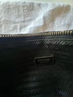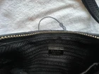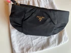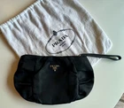 Prada clutch is black nylon with a gold zipper closure and black leather wristlet strap. Gold Prada logo on the outside of bag with Prada lining on the inside. Interior pockets. Dust bag is included. Made in Italy. This chic wristlet has only been gently used on a few occasions. Exterior bag shows no visible signs of wear. Interior is perfectly clean with only slight signs of wear on the interior leather detail. Please see up close photos for most accurate depiction. Stored in its dust bag in a very clean, smoke-free home. Thanks for looking!