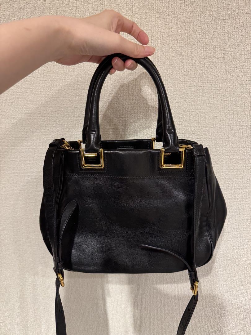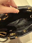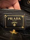 This Prada Ribbon Bag is a stylish and practical choice! The sleek black leather with gold accents gives it a luxurious yet timeless look. The adjustable strap makes it super versatile—wear it as a shoulder bag or carry it by hand. Despite some minor wear from use, it still looks elegant, and the compact size fits essentials perfectly. Great for everyday chic!