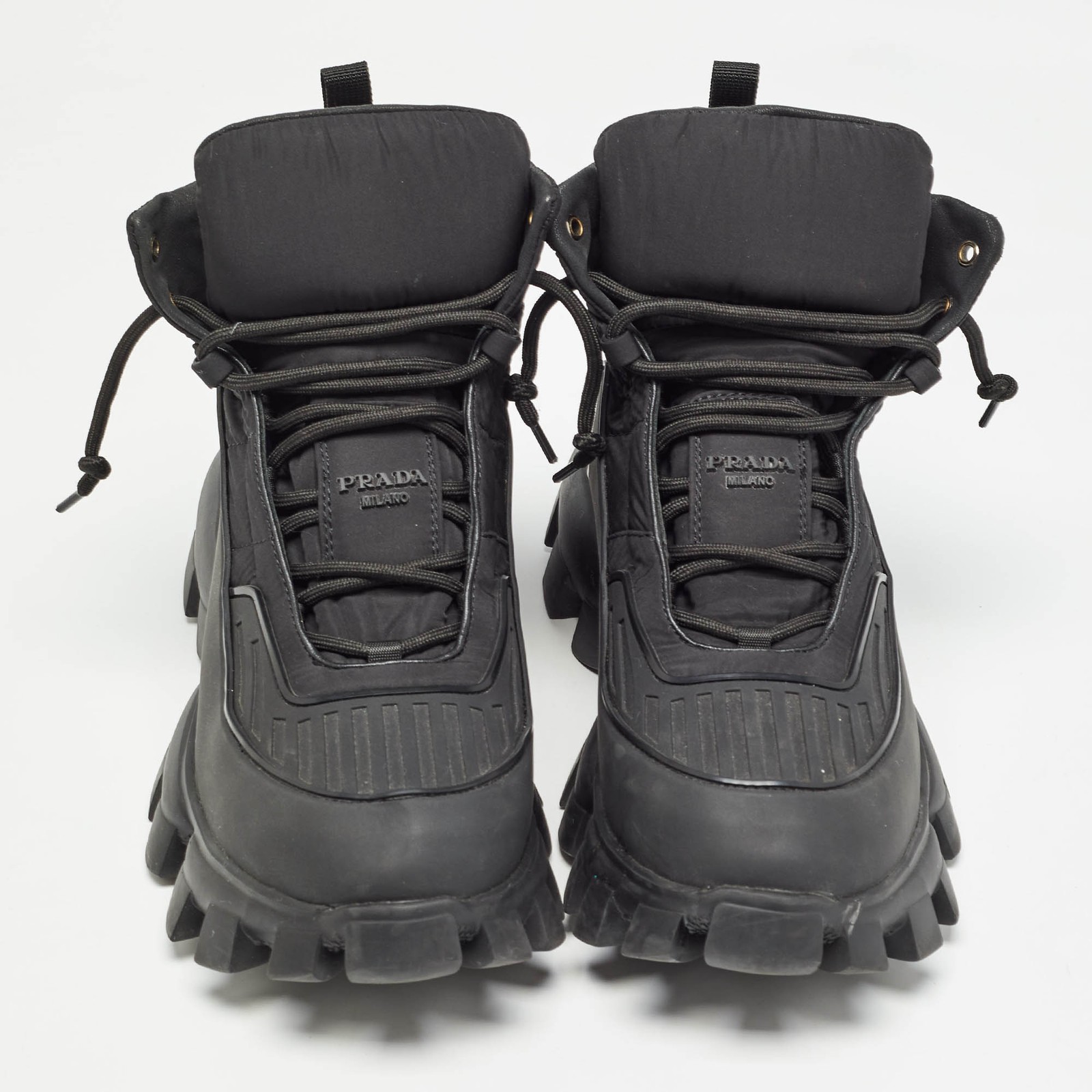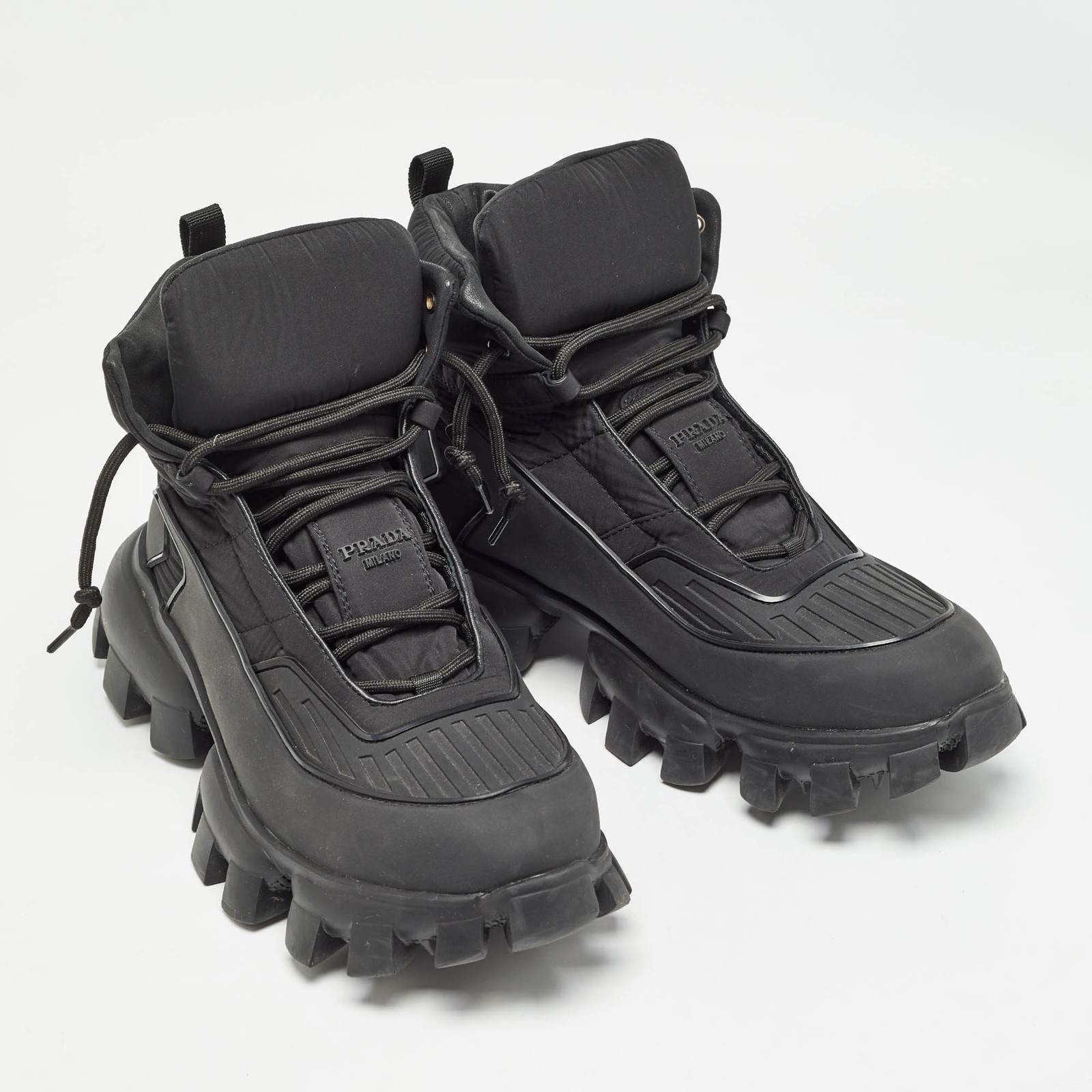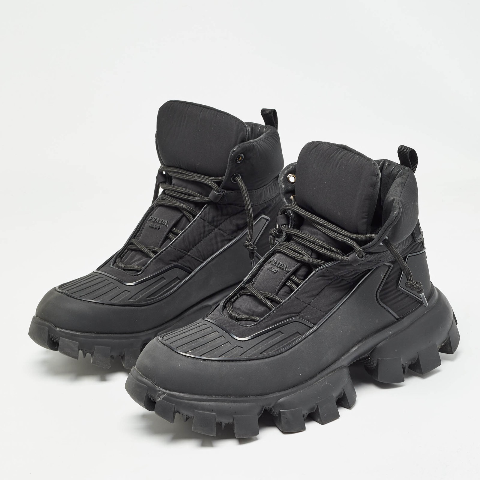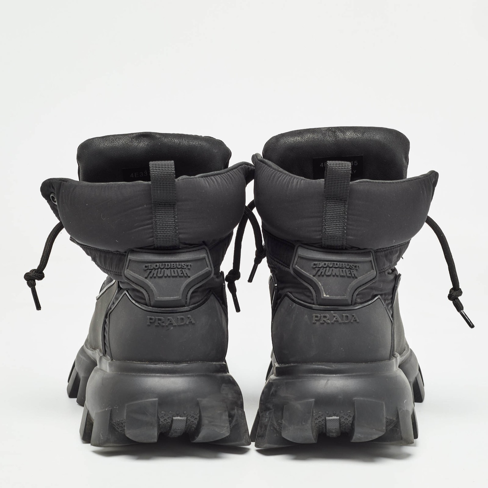 Comfort and high fashion are brought together in these Prada Cloudbust Thunder sneakers. They have been crafted from high quality materials into a statement making design. Add them to your closet and walk the streets in styleCertified by The Luxury Closet - This item has gone through a detailed authentication process overseen by our experts. We offer a lifetime guarantee of authenticity on all our items. Import duties, taxes and charges are not included in the item price. These charges are the buyers responsibility. Please check with your country’s customs office to determine what these additional cost will be prior to buying. Our eBay Store About Us Contact Us Add to Favorite Sellers Prada Black Rubber and Nylon Cloudbust Thunder High Top Sneakers Size 45 $433.4 Comfort and high fashion are brought together in these Prada Cloudbust Thunder sneakers. They have been crafted from high quality materials into a statement making design. Add them to your closet and walk the streets in style Product Details Brand Color Black Dimensions Material Nylon, Rubber Size 45 Outsole Width Outsole Length Heel Height Includes Certified by The Luxury Closet This item has gone through a detailed authentication process overseen by our experts. We offer a lifetime guarantee of authenticity on all our items. How We Check The in-house team of experts at The Luxury Closet is highly trained to verify the authenticity and the condition of the luxury products. They ensure that only 100% authentic items are put on sale.The evaluation process is unique with its own mix of assessment criteria and differs according to the category. Each item is evaluated based on the following combination of hallmarks, hardware, stitching, symmetry, material, craftsmanship, stamping, codes, hologram stickers, and packaging. Our authenticators also check if the items have been modified or amended (e.g., aftermarket diamonds, replaced batteries, repaired bags, etc.) International Buyers Import duties, taxes and charges are not included in the item price. These charges are the buyers responsibility. Please check with your country’s customs office to determine what these additional cost will be prior to buying.