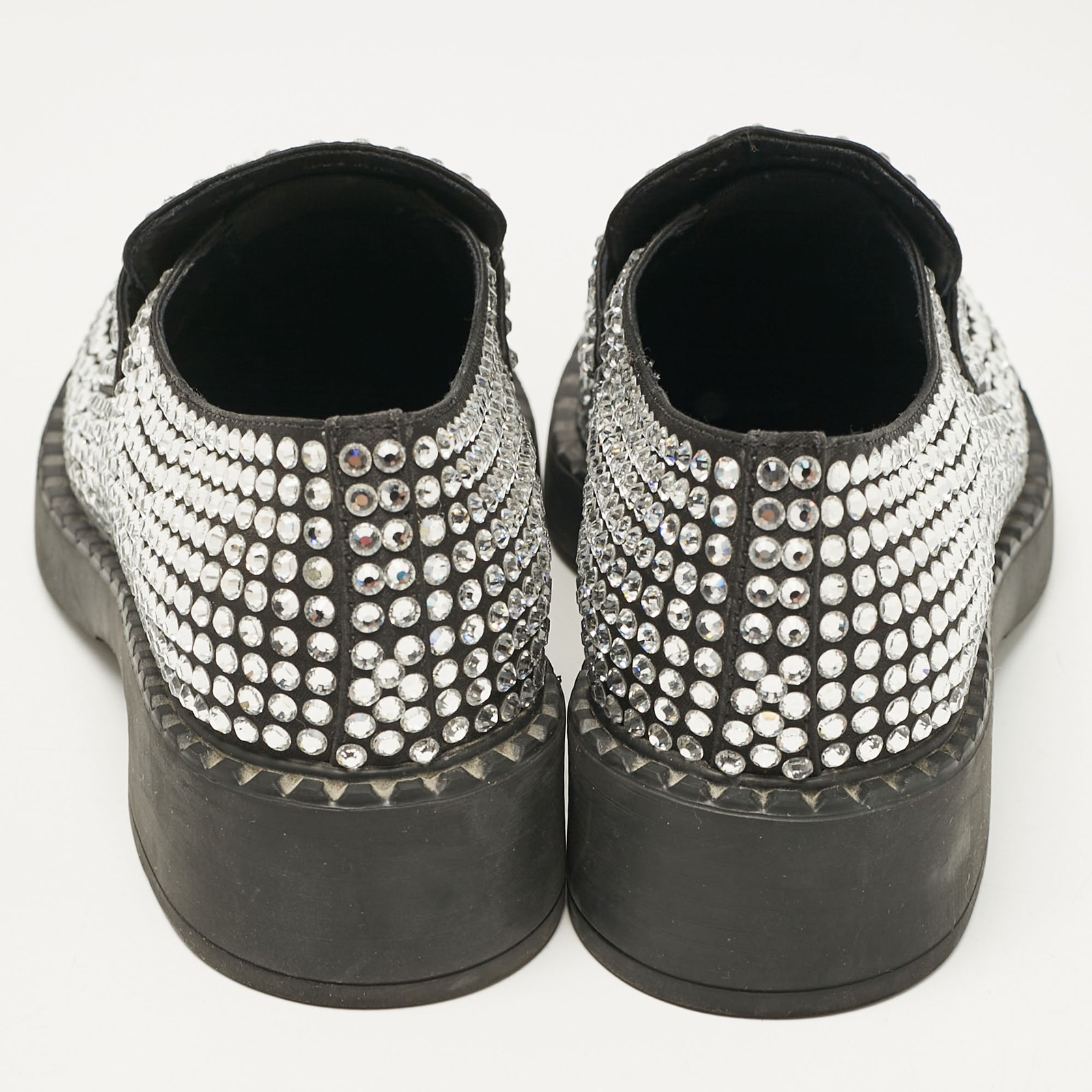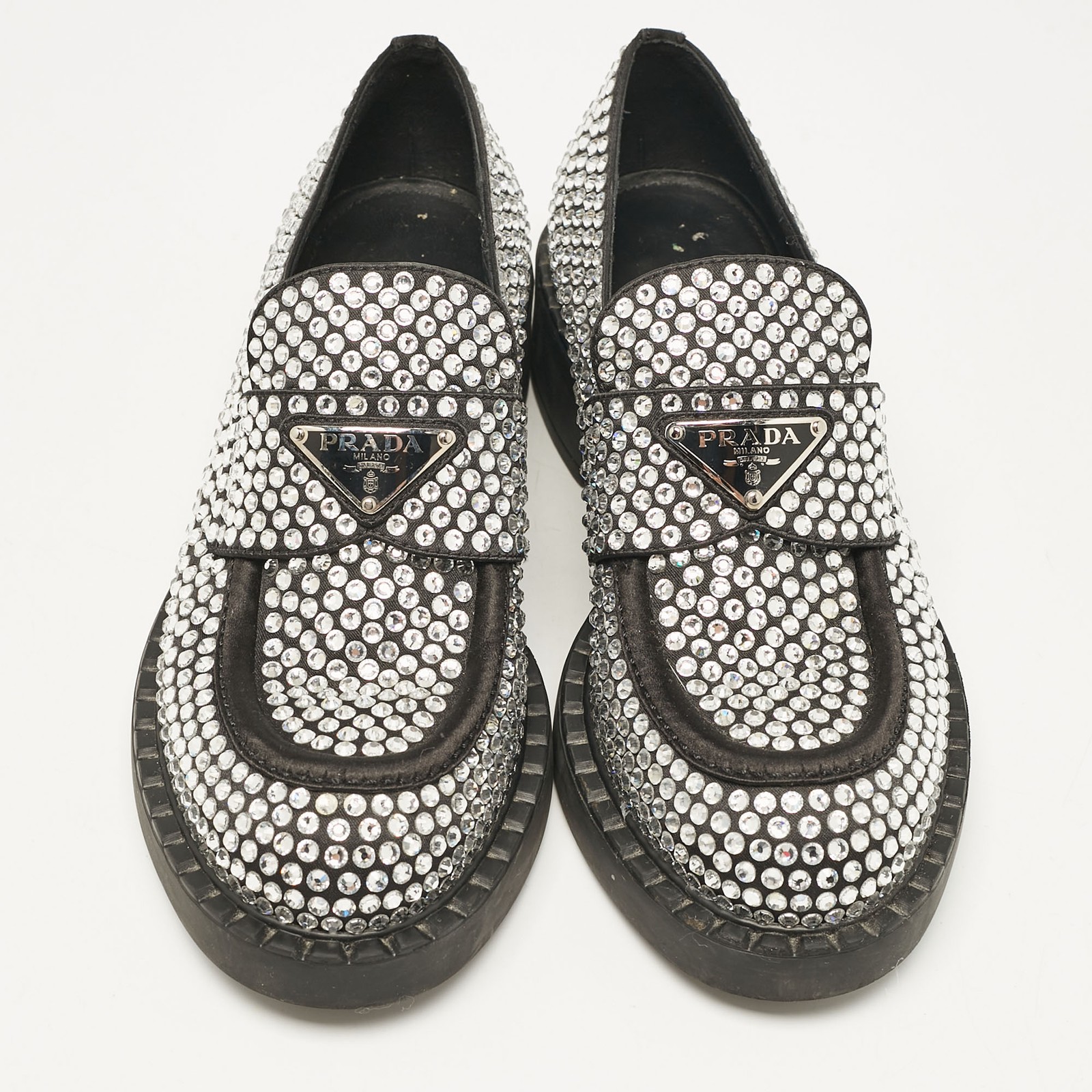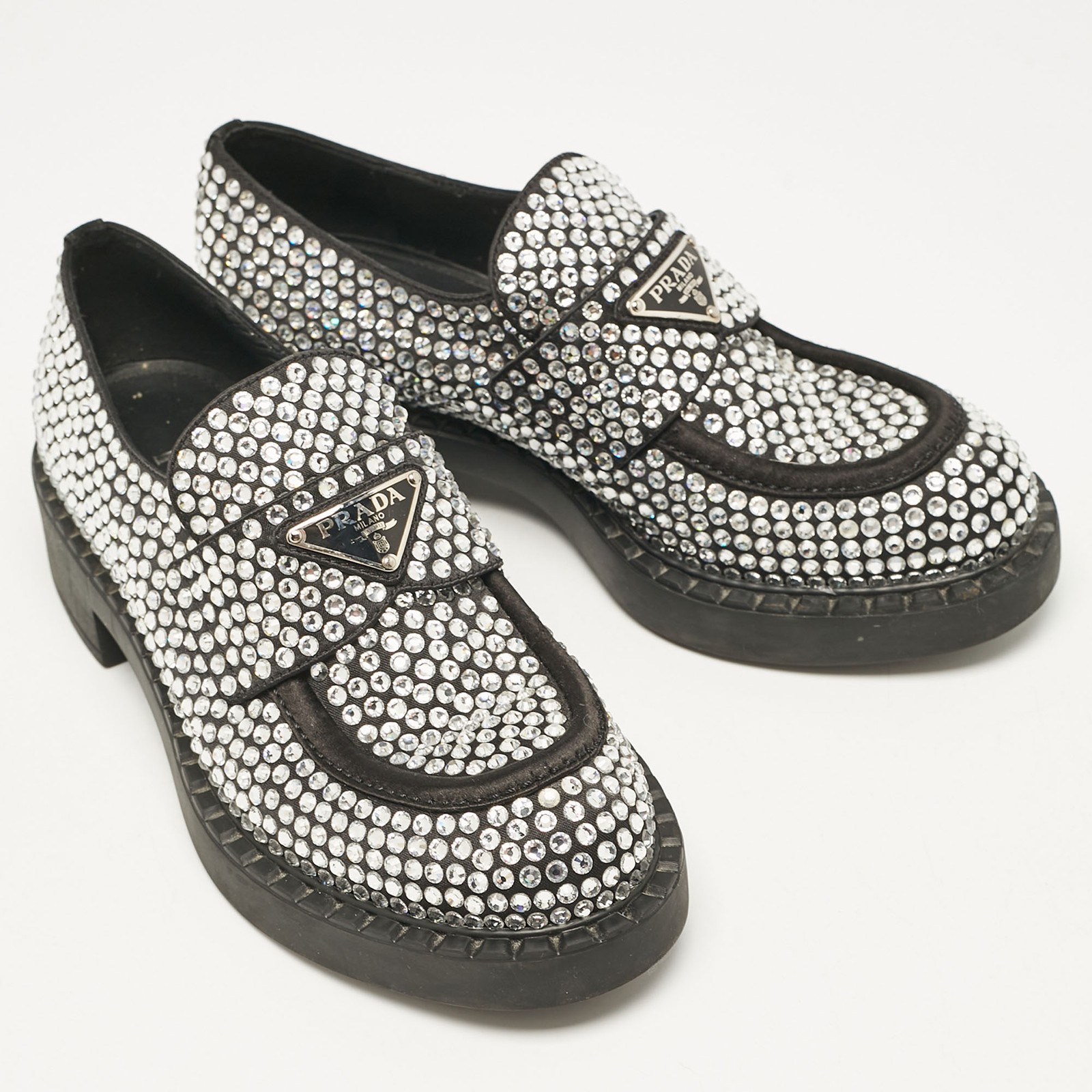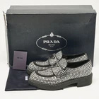 Indulge in the ultimate expression of elegance with these exquisitely crafted Prada slip ons. Made in Italy, the black satin loafers are adorned with sparkling crystals, offering a touch of glamor.Certified by The Luxury Closet - This item has gone through a detailed authentication process overseen by our experts. We offer a lifetime guarantee of authenticity on all our items. Import duties, taxes and charges are not included in the item price. These charges are the buyers responsibility. Please check with your country’s customs office to determine what these additional cost will be prior to buying. Our eBay Store About Us Contact Us Add to Favorite Sellers Prada Black Satin Crystals Slip On Loafers Size 36 $517 Indulge in the ultimate expression of elegance with these exquisitely crafted Prada slip ons. Made in Italy, the black satin loafers are adorned with sparkling crystals, offering a touch of glamor. Product Details Brand Color Black Dimensions Material Satin Size 36 Outsole Width 8 cm Outsole Length 26 cm Heel Height Includes Original Dustbag, Info Booklet, Original box damaged, Branded Box Certified by The Luxury Closet This item has gone through a detailed authentication process overseen by our experts. We offer a lifetime guarantee of authenticity on all our items. How We Check The in-house team of experts at The Luxury Closet is highly trained to verify the authenticity and the condition of the luxury products. They ensure that only 100% authentic items are put on sale.The evaluation process is unique with its own mix of assessment criteria and differs according to the category. Each item is evaluated based on the following combination of hallmarks, hardware, stitching, symmetry, material, craftsmanship, stamping, codes, hologram stickers, and packaging. Our authenticators also check if the items have been modified or amended (e.g., aftermarket diamonds, replaced batteries, repaired bags, etc.) International Buyers Import duties, taxes and charges are not included in the item price. These charges are the buyers responsibility. Please check with your country’s customs office to determine what these additional cost will be prior to buying.