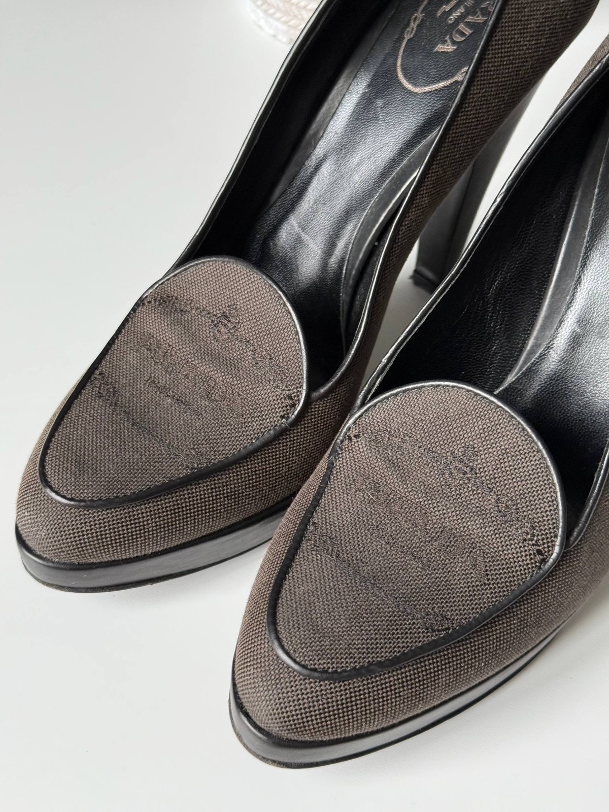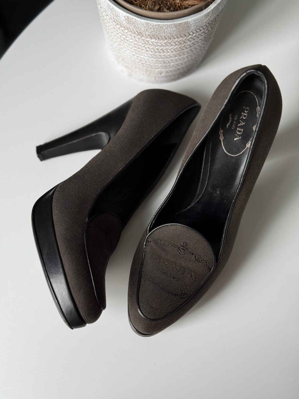 These Prada Brown Canvas Platform Pumps with Embossed Logo Detail are a stylish and comfortable option for various occasions. The almond toe shape, ultra high platform heel, and stiletto heel style add a touch of elegance. Made of leather with a canvas lining and insole, these shoes are lightweight, breathable, and perfect for all seasons. The brown color and logo accents give them a sophisticated look, reflecting the quality and design of the brand. Made in Italy, these platform pumps in size 37.5 / 7.5 US are a versatile choice for any fashion-forward woman.