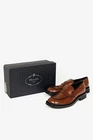 Circa 2019, these Italian-made loafers from Prada are crafted with a Bright Calf leather in a Bruciato brown, and feature flat block heels, closed rounded toes, penny straps, piped detailing, small platforms, and leather lining and soles. Size: 12 Condition: Excellent; light scuffing on upper, light wear on outsoles. Comes with care card, dustbags, and box. Approximate Measurements: Insole Length: 12” (30.5 cm) Heel Height: 1.5” (4 cm) Platform Height: 0.75" (2 cm) Composition: Leather upper and lining, leather and manmade outsoles.