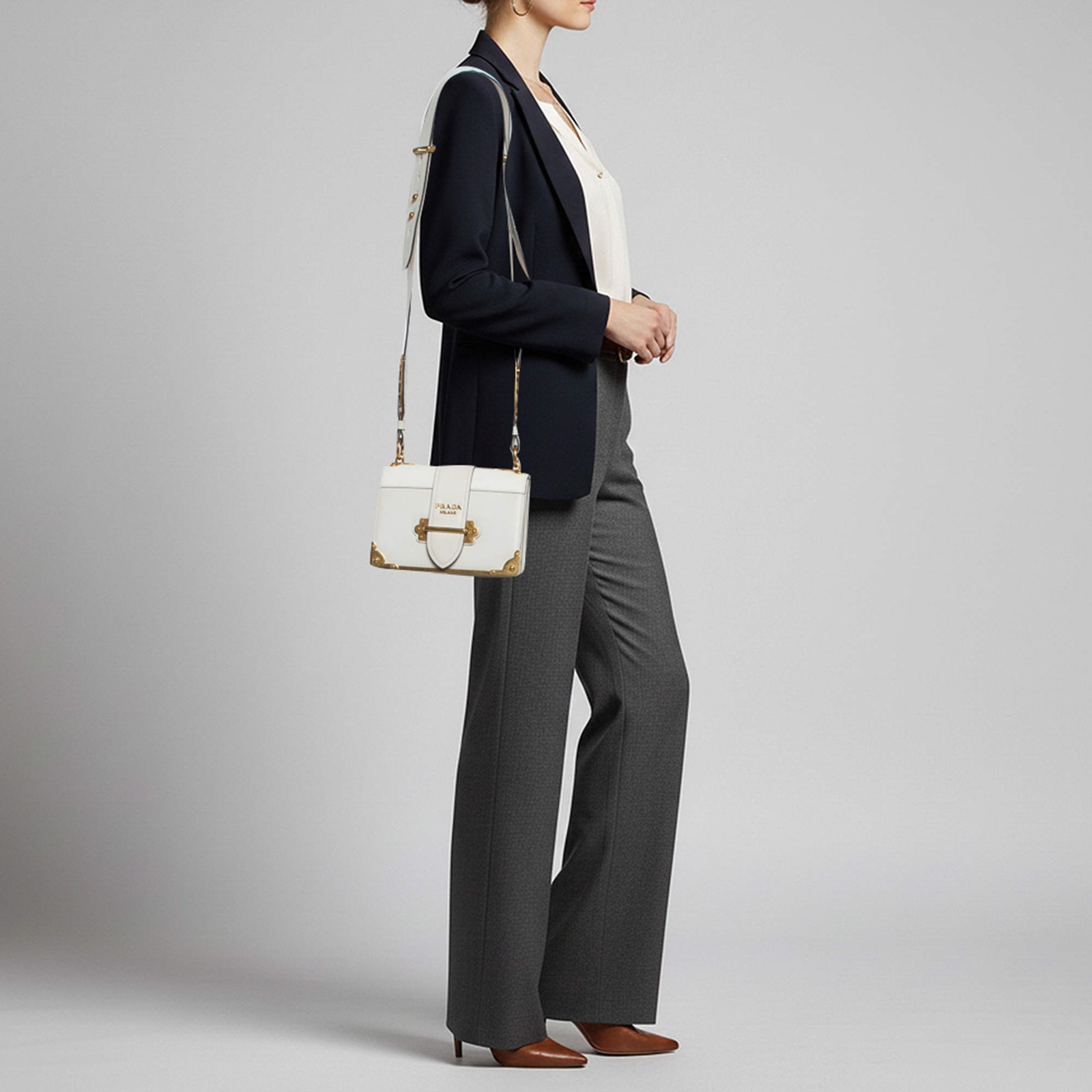Our eBay Store About Us Contact Us Add to Favorite Sellers Prada Cahier White Leather Flap Shoulder Bag Inspired by vintage book covers, the Prada Cahier stands out in crisp white leather with signature gold-tone corner hardware and buckle details. Wear it on the shoulder or crossbody with the wide strap, and let it add a statement finish to everyday outfits and special plans alike. Product Details Brand Prada Includes The Luxury Closet Packaging Certified by The Luxury Closet This item has gone through a detailed authentication process overseen by our experts. We offer a lifetime guarantee of authenticity on all our items. How We Check The in-house team of experts at The Luxury Closet is highly trained to verify the authenticity and the condition of the luxury products. They ensure that only 100% authentic items are put on sale.The evaluation process is unique with its own mix of assessment criteria and differs according to the category. Each item is evaluated based on the following combination of hallmarks, hardware, stitching, symmetry, material, craftsmanship, stamping, codes, hologram stickers, and packaging. Our authenticators also check if the items have been modified or amended (e.g., aftermarket diamonds, replaced batteries, repaired bags, etc.) International Buyers Import duties, taxes and charges are not included in the item price. These charges are the buyers responsibility. Please check with your country’s customs office to determine what these additional cost will be prior to buying.