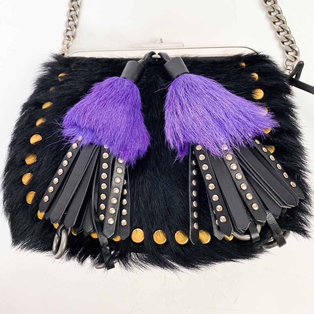 PRADA chain shoulder bag with real fur, tassel, and stud details in black. Model number: 1BH074. Size: Height 5.51 inches, Width 6.69 inches, Depth 2.36 inches, Shoulder strap length 48.03 inches. Specification: Clasp closure, 2 internal open pockets. Material: Harako, Leather. Color: Black, Purple. Accessories: Guarantee card, tassel, clochette, key ring. Condition: Extremely beautiful with no noticeable scratches or dirt. There may be slight dirt or small scratches from use, but it is at a level that does not bother you. I promise fast shipping via FedEx or DHL as soon as possible! Import duties, taxes and charges are not included in the item price or shipping charges. These charges are the buyer’s responsibility. These charges are normally collected by the delivering freight (shipping) company or when you pick the item up - do not confuse them for additional shipping charges.