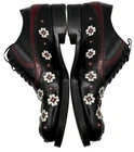 Prada Studded Floral Leather Oxfords – Size 40 Very Good Pre-Owned Condition A standout pair for the style connoisseur, these lace-up oxfords by Prada blend traditional craftsmanship with avant-garde detailing. Constructed in Italy from glossy black leather with deep burgundy trim, the shoes feature dimensional white and burgundy floral appliqués and pyramid studs throughout for an artistic, almost sculptural effect. A squared toe and stacked leather heel complete the bold silhouette, while the interior is finished in rich purple leather with Prada logo stamping. Size: EU 40 Color: Black with burgundy accents and ivory floral embellishments Material: Leather upper and sole Made in Italy Condition: Very good pre-owned condition. Light wear on soles and heels. Uppers and appliqués remain intact and striking. An editorial-worthy pair ideal for collectors, stylists, or those ready to make a fearless fashion statement.