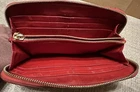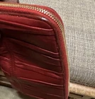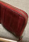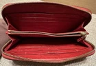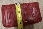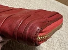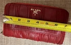 Prada Gold Logo Red Leather Wallet Zip Around Preowned , Lampo zippers, Authentic AS IS, poor condition. Major signs of use throughout, darkening throughout : on the outer leather, edges , zipper fabric, inside leather trim and fabric pockets, dirty inside lining, rubbing and discoloration of the inside leather trim, zipper pulls leather is torn, damaged edges, all consistent with the preowned condition and extensive pictured. Please refer to the pics as they are part of the description and best reflect the condition of the item. No box. Please refer to the pictures for condition and measurements, zoom in and decide if this is for you. As is, final sale, no returns. Please pay within 48 hrs of auction end or the item will be relisted and buyer reported. Non smoking, pet free home. Thanks for looking!