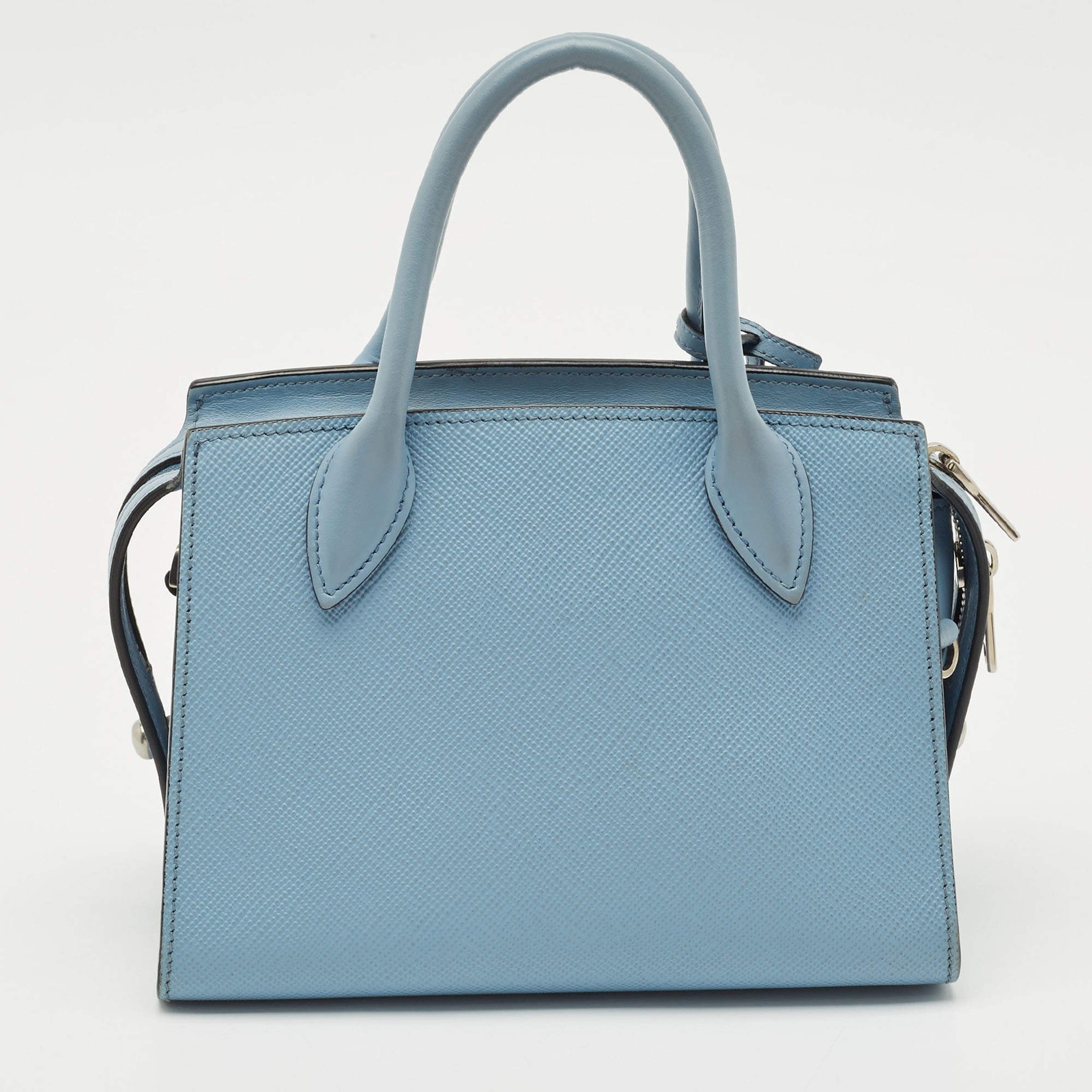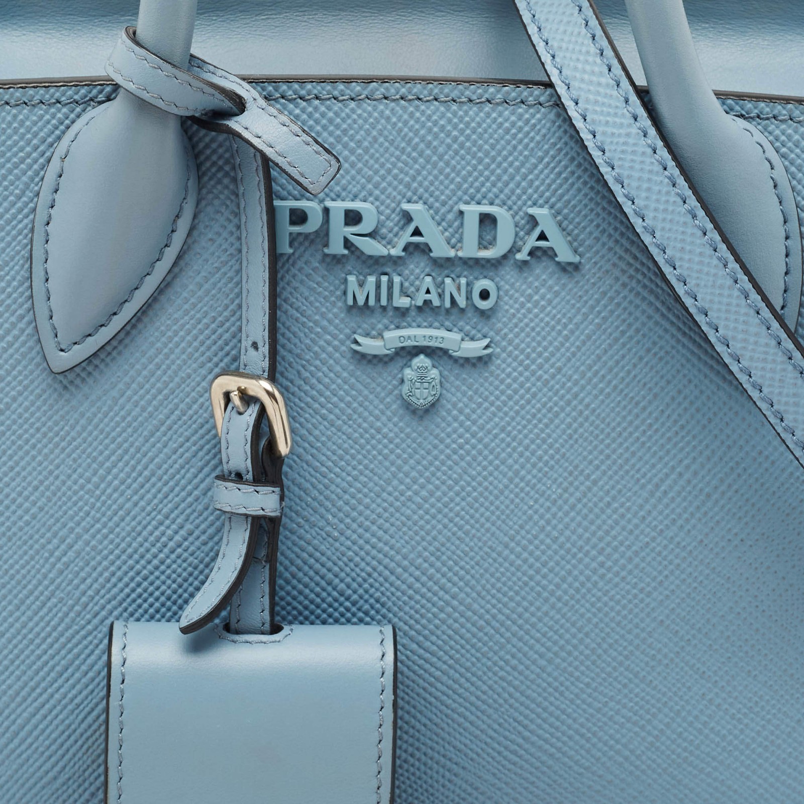 Our eBay Store About Us Contact Us Add to Favorite Sellers Prada Light Blue Saffiano Leather Small Monochrome Tote In soft light blue Saffiano leather, Prada’s Monochrome tote is a fresh take on minimalism. With tonal logo detailing and clean lines, it’s a chic companion for those who prefer quiet elegance in compact form. Product Details Brand Prada Includes Original Dustbag, Info Booklet, 2 Strap, 2 Detachable Straps Certified by The Luxury Closet This item has gone through a detailed authentication process overseen by our experts. We offer a lifetime guarantee of authenticity on all our items. How We Check The in-house team of experts at The Luxury Closet is highly trained to verify the authenticity and the condition of the luxury products. They ensure that only 100% authentic items are put on sale.The evaluation process is unique with its own mix of assessment criteria and differs according to the category. Each item is evaluated based on the following combination of hallmarks, hardware, stitching, symmetry, material, craftsmanship, stamping, codes, hologram stickers, and packaging. Our authenticators also check if the items have been modified or amended (e.g., aftermarket diamonds, replaced batteries, repaired bags, etc.) Please note that this handbag may have a perfume scent, as it was stored and packaged in Dubai where such fragrances are commonly used. International Buyers Import duties, taxes and charges are not included in the item price. These charges are the buyers responsibility. Please check with your country’s customs office to determine what these additional cost will be prior to buying.