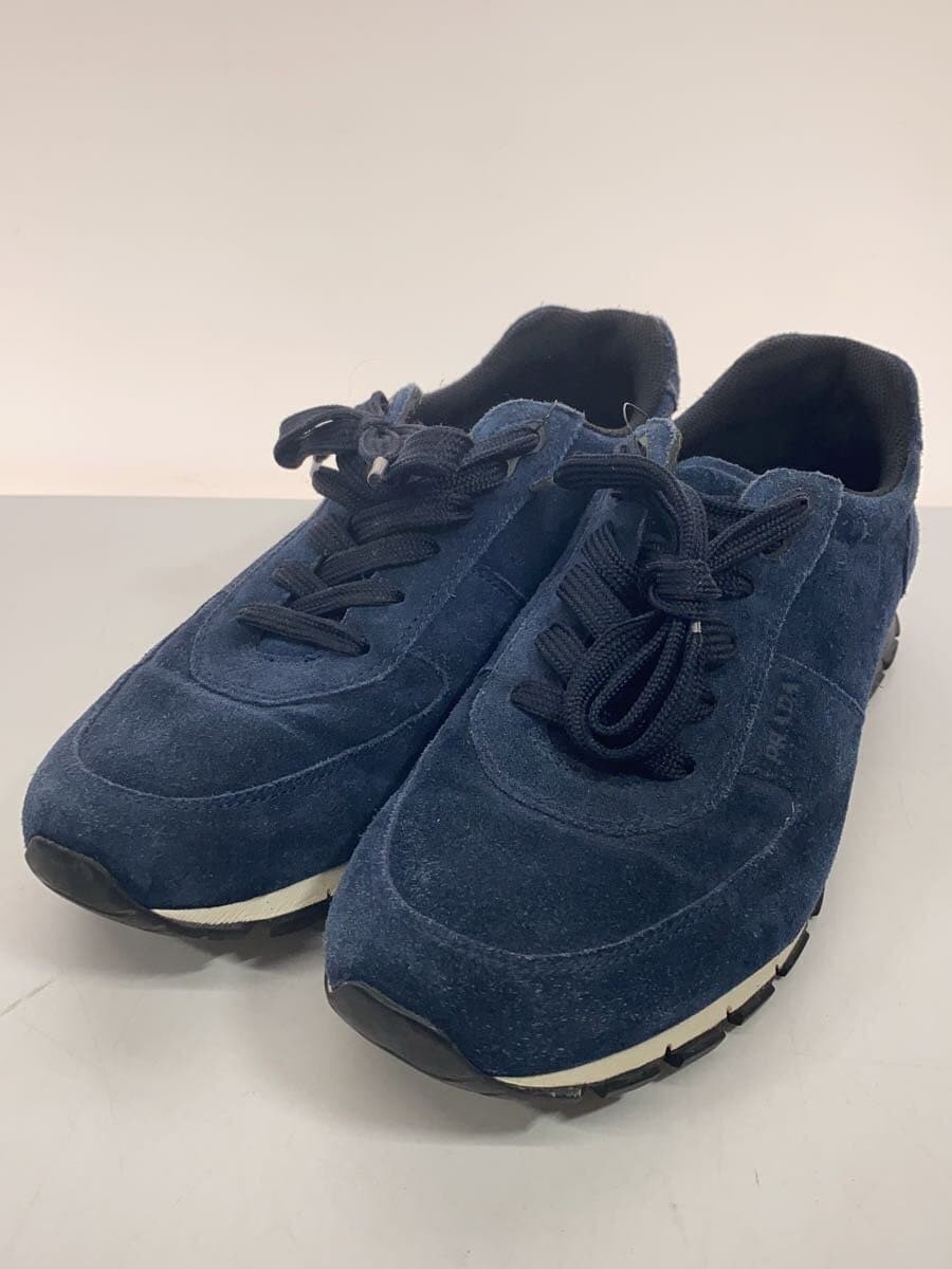 $ 441.6PRADA Triangle Logo Nylon and Leather Sneakers in Blue UK7.5 2EG401