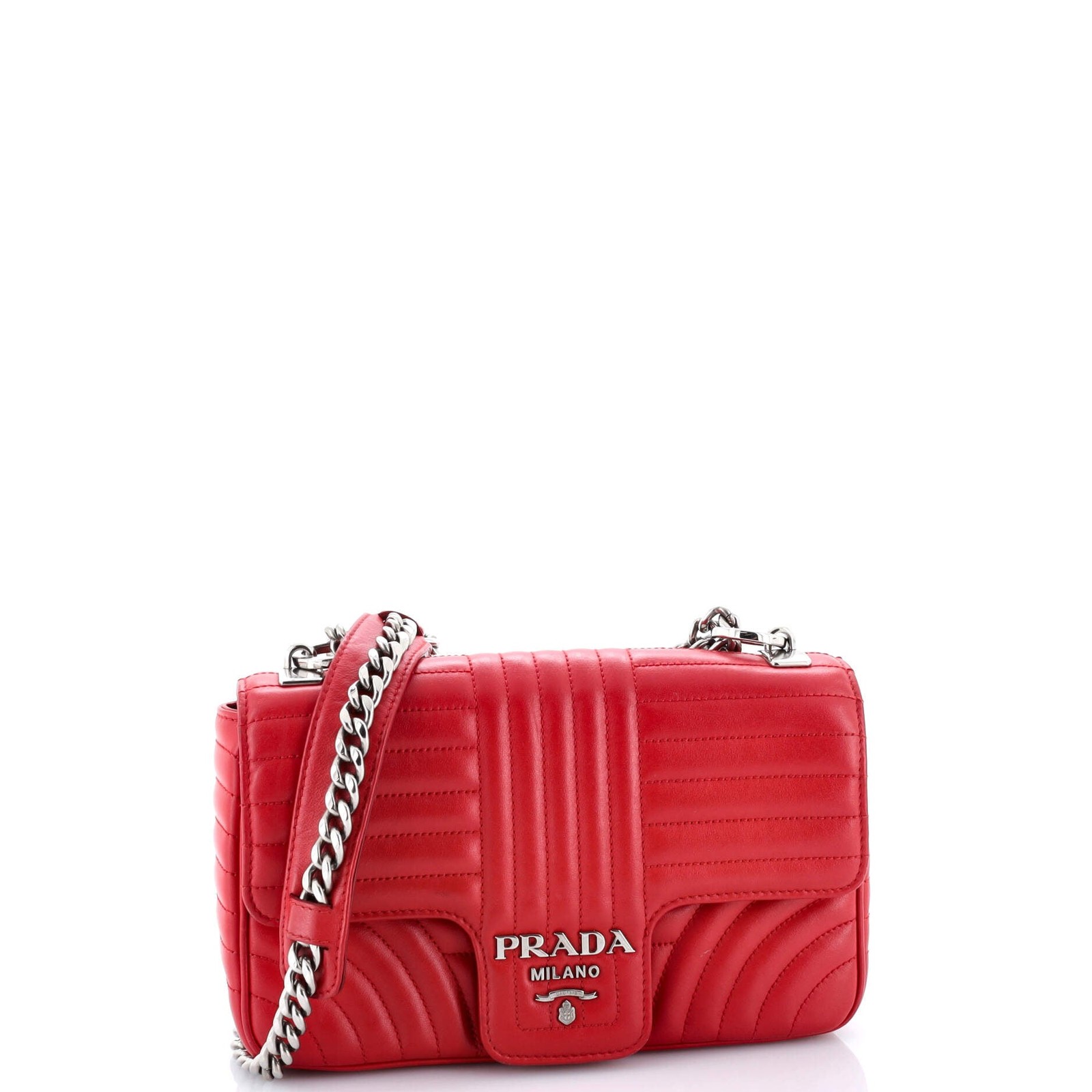 These are professional pictures of the actual item offered by Rebag. Estimated Retail Price: $2,550 Condition: Very good. Exterior: scuffs, minor creases, minor edge wear, minor corner wear | Handles/Straps: creases, minor scuffs | Interior: moderate odor, scuffs | Hardware: scratches Accessories: No Accessories Measurements: Handle Drop 12", Height 6", Width 9.5", Depth 2.5", Strap Drop 20.5" Designer: Prada Model: Chain Flap Shoulder Bag Diagramme Quilted Leather Medium Exterior Material: Leather Exterior Color: Red Interior Material: Fabric Interior Color: Red Hardware Color: Silver Item Number: 342567/2