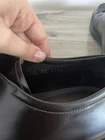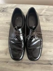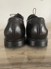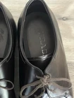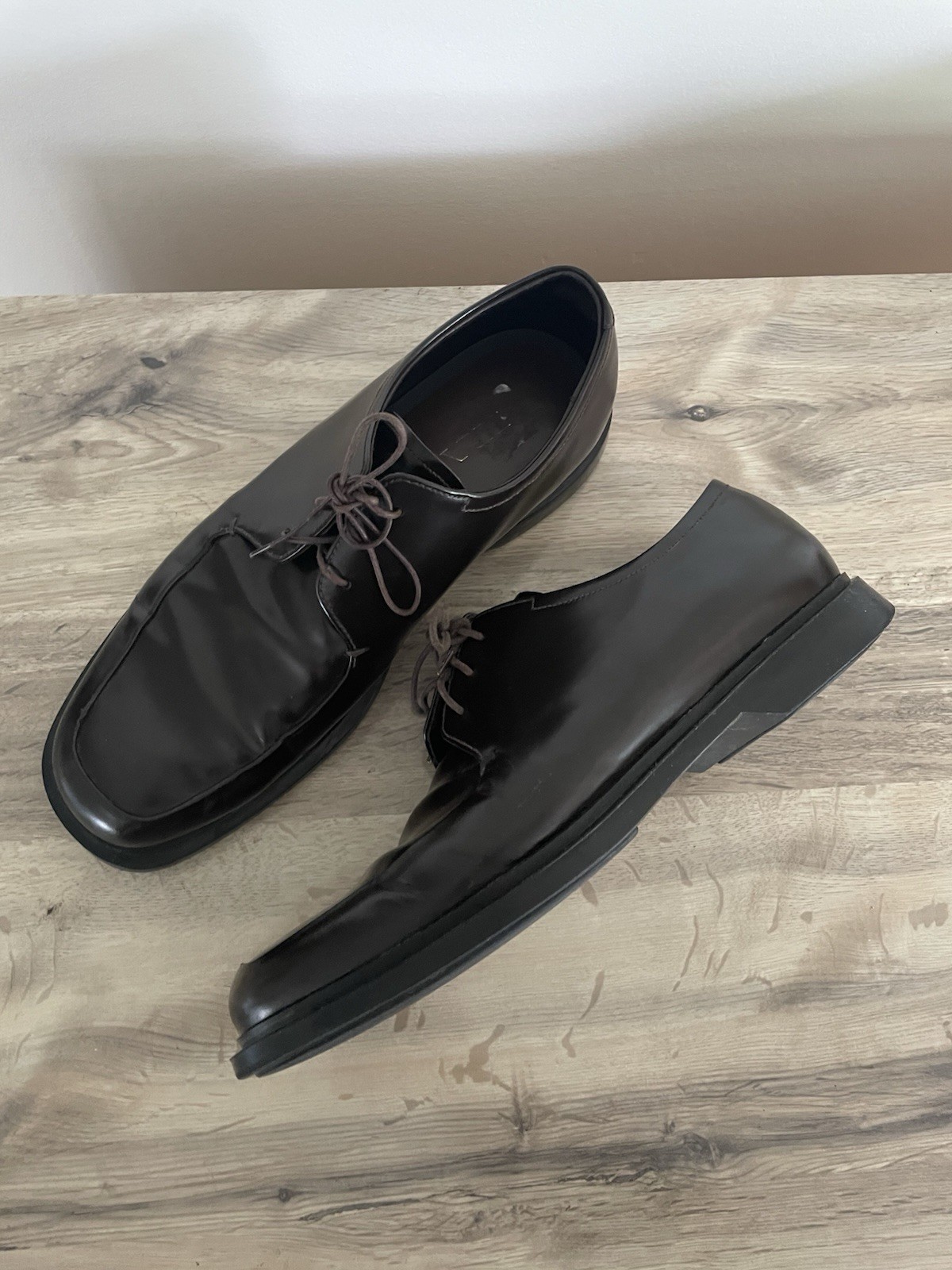 A crisp and classic dress shoe by Prada! Prada Dark brown patent leather Tie cup closure Square toe 12E 0744 Rubber soles Made in Italy Great overall condition, the soles show very light tread. There are a few scuffs and scratches on the leather and some creases. I took pictures of the major ones overall clean.